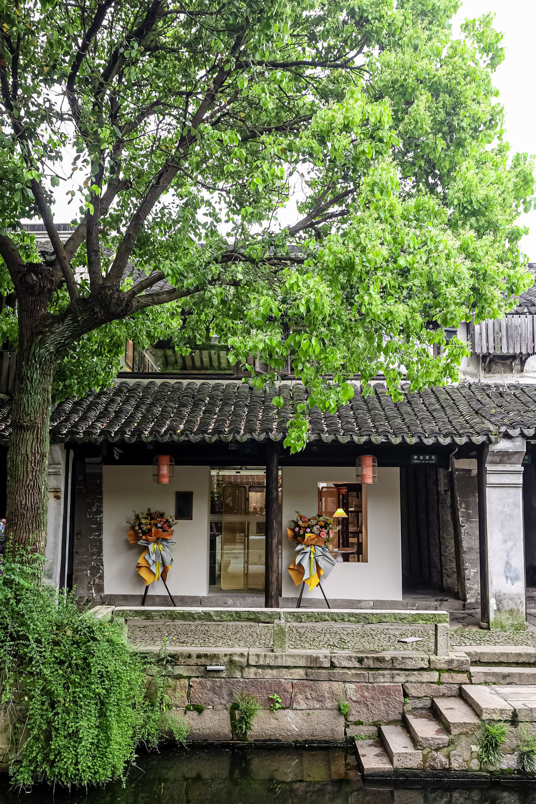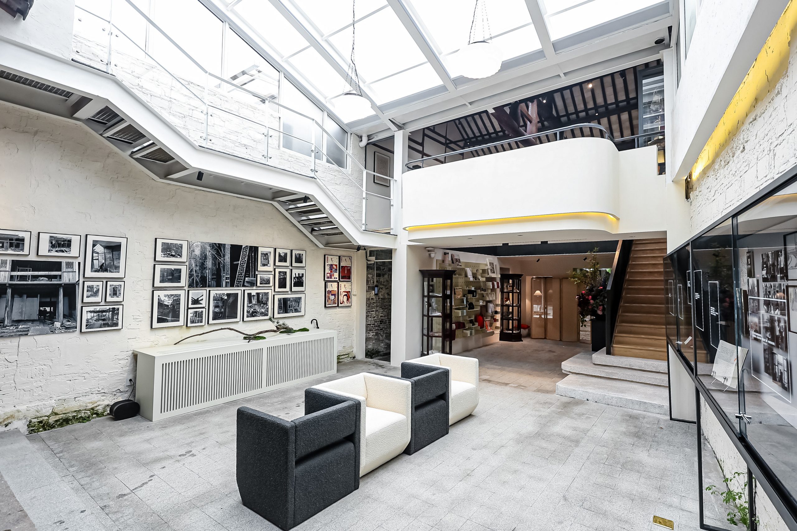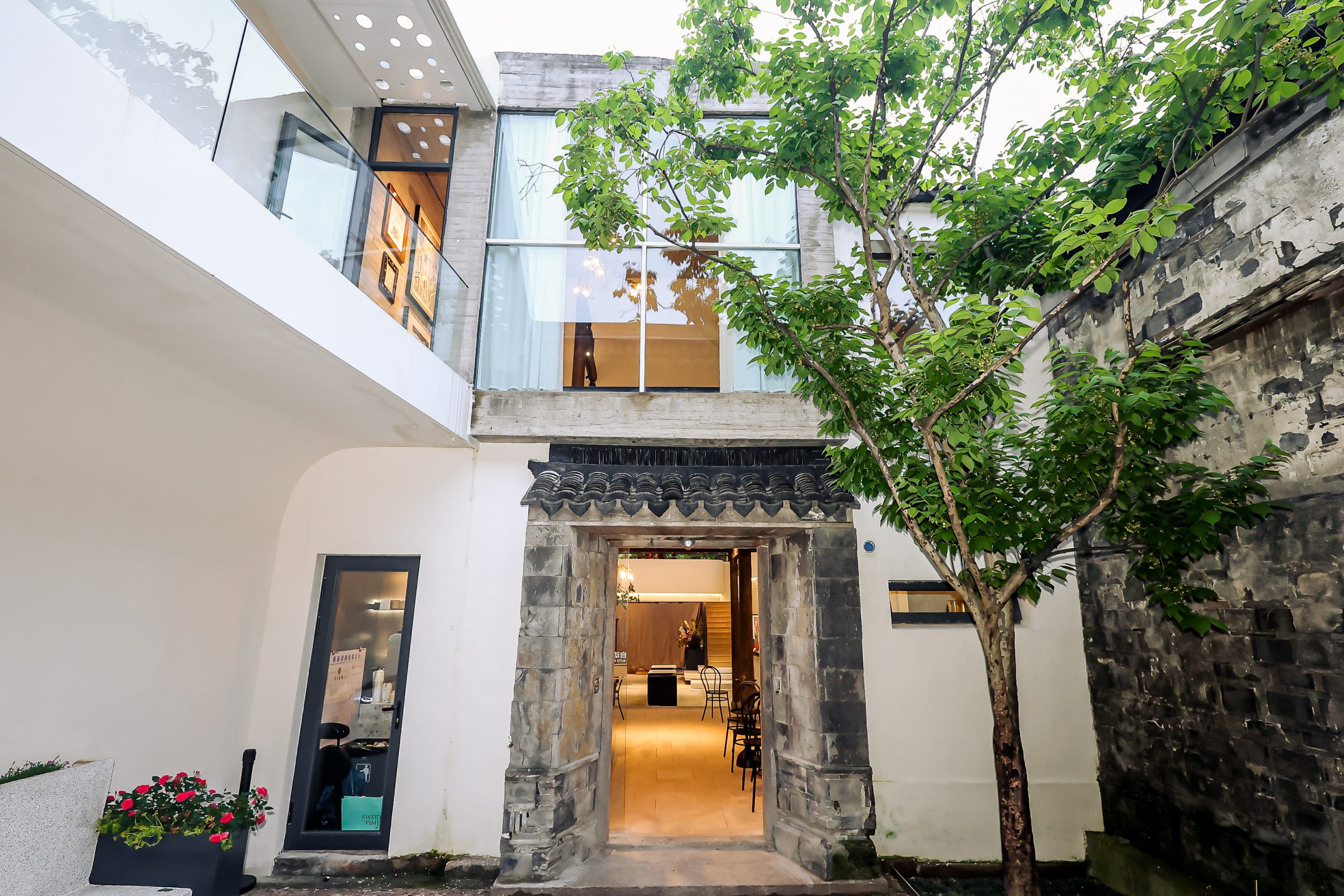家屋の前には小川に面した石造りの小道が東西に伸び、朝日や夕日がその小道に差し込みます。一方、南北に伸びる数百メートルの路地は少し薄暗く、真新しい白壁とモダンな風情の「繁花書房」は、まるで一夜にして花が咲いたかのように、淡い霧に包まれていた灰色の瓦と暗い壁に挟まれた路地を、明るく照らし出しました。