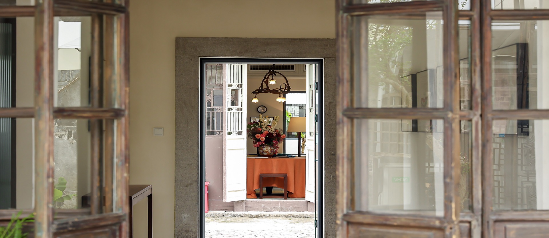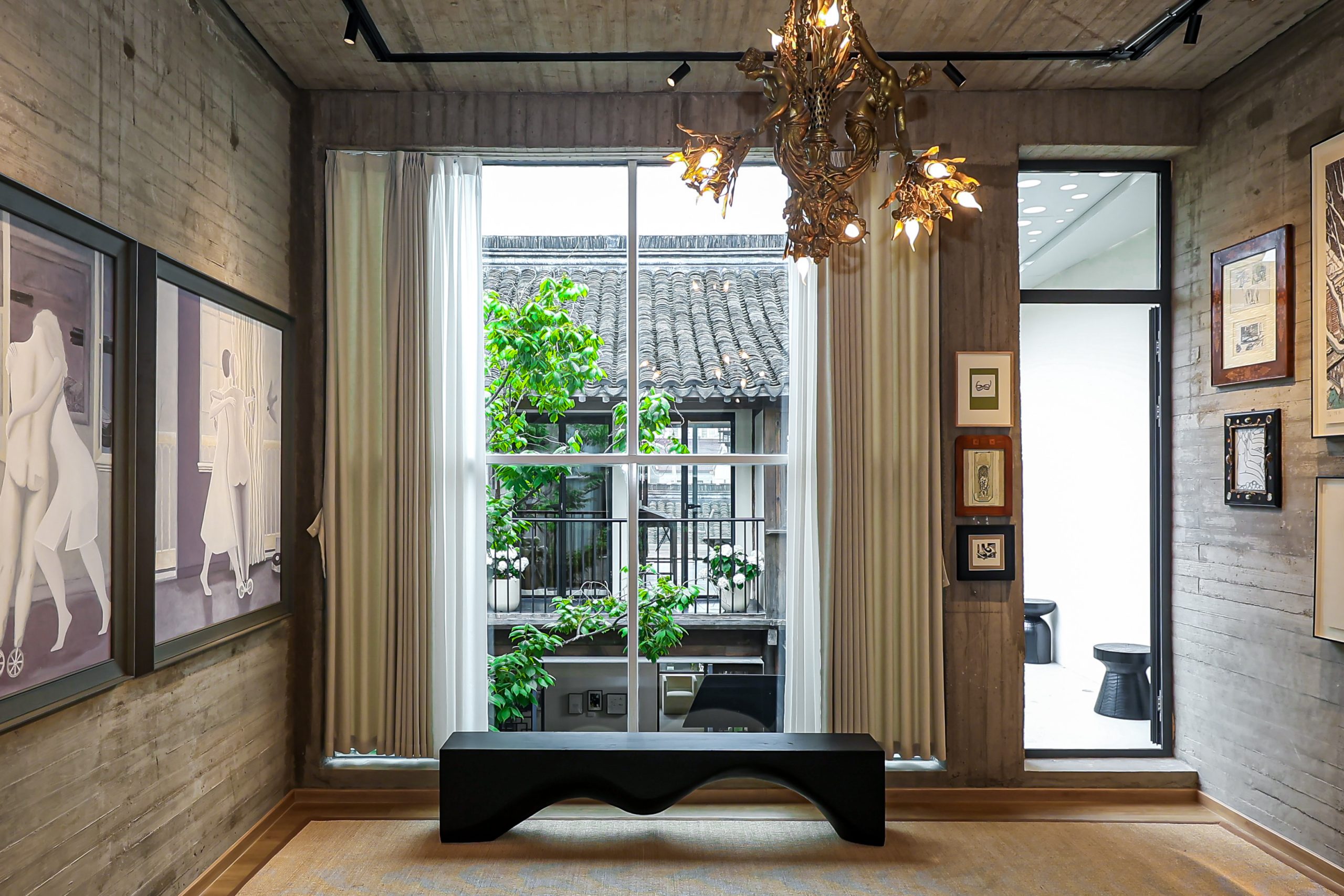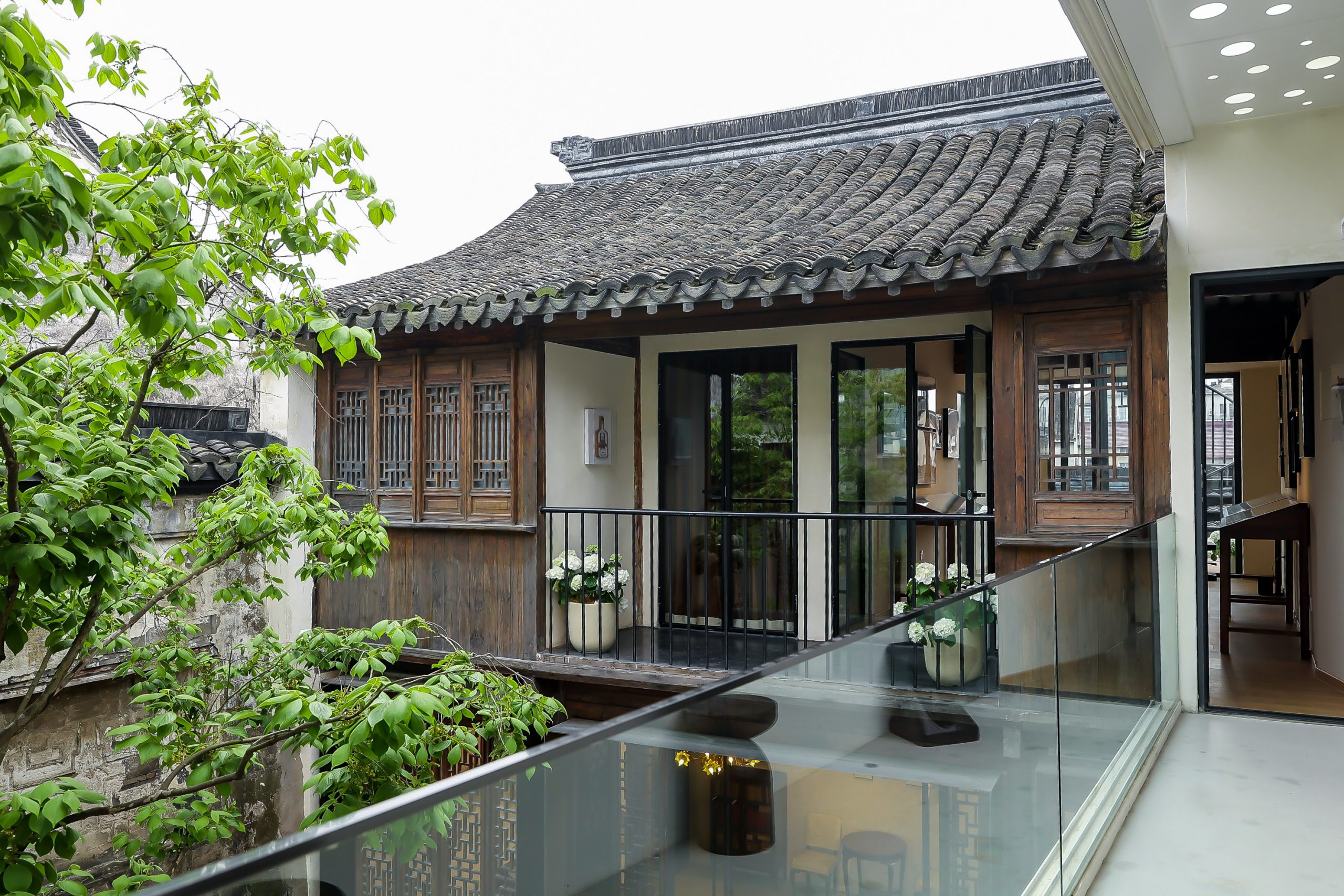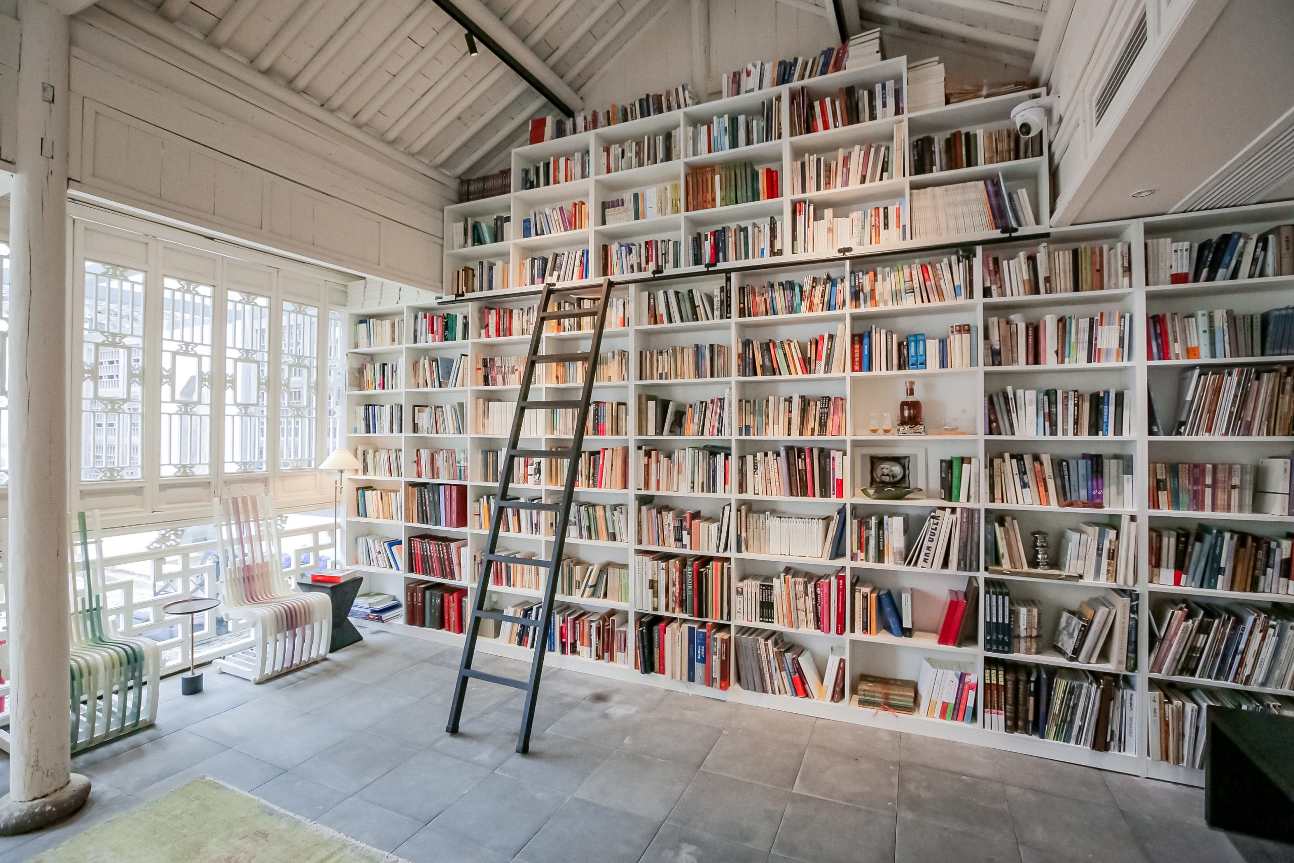 家屋の前には小川に面した石造りの小道が東西に伸び、朝日や夕日がその小道に差し込みます。一方、南北に伸びる数百メートルの路地は少し薄暗く、真新しい白壁とモダンな風情の「繁花書房」は、まるで一夜にして花が咲いたかのように、淡い霧に包まれていた灰色の瓦と暗い壁に挟まれた路地を、明るく照らし出しました。