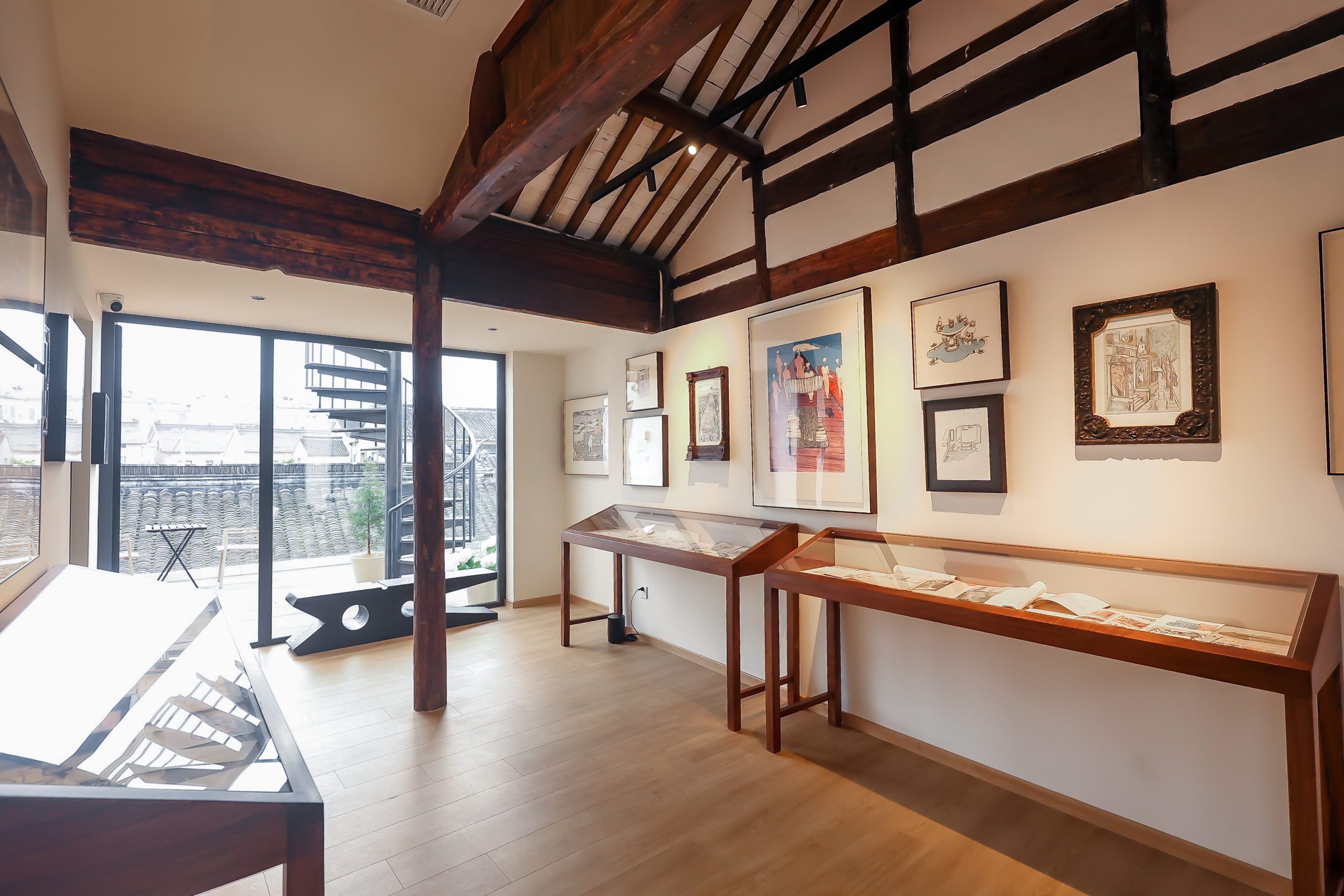 数年の月日をかけて改築された「繁花書房」の空間でも、金宇澄は丹念に物語を紡いでいます。彼の小説や絵画がモチーフとなっているアイテムも多く、一歩一景、歩くたびに新しい光景が現れます。最初のエリアでは「繁花」が文学から映像作品に至るまでの物語が、2つめのエリアでは金宇澄の両親の物語が、3つめのエリアでは作家自身の物語が、裏庭とアトリエでは芸術家としての金宇澄の物語が示されています。この江南建築の家屋は、文学と創作の芳香が満ち溢れ、読書スペースにある金宇澄と彼の両親の蔵書を、読者はソファに座って自由に本を読むこともできます。
