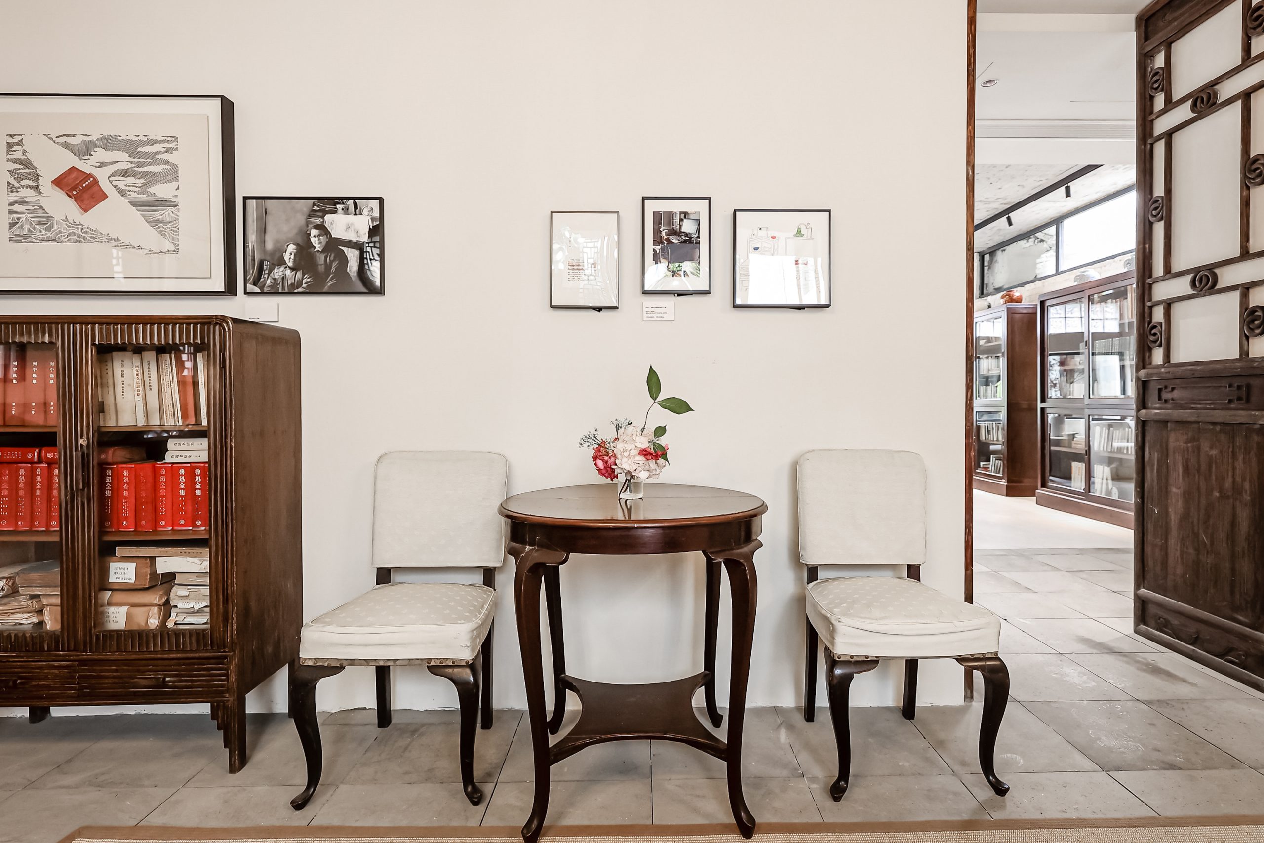 書斎内には“座ってはいけない”と書かれた2つの旧式の木製椅子があり、真ん中にはより貴重な丸テーブルが置かれています。それは1951年に、祖母がこの家から上海に持って行ったもので、金宇澄が2011年以降、長く愛用し、「繁花」や両親について綴った「回望」を書き上げた家具でもあります。