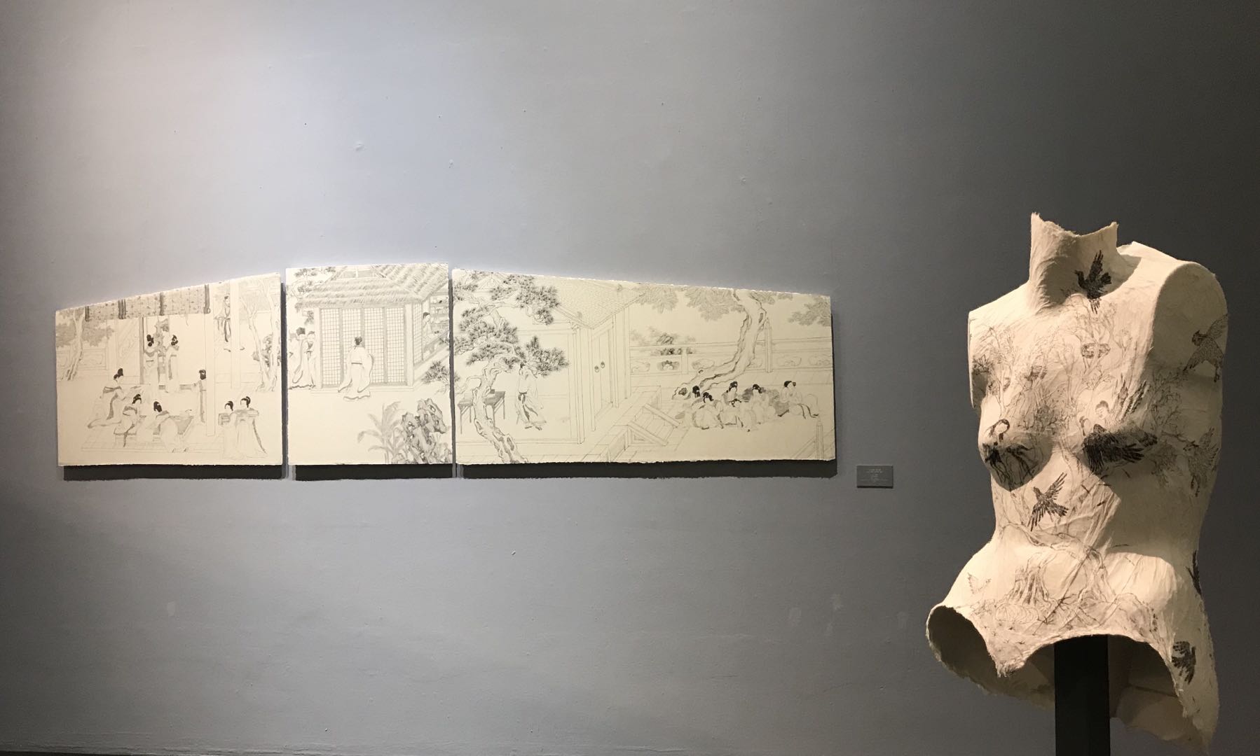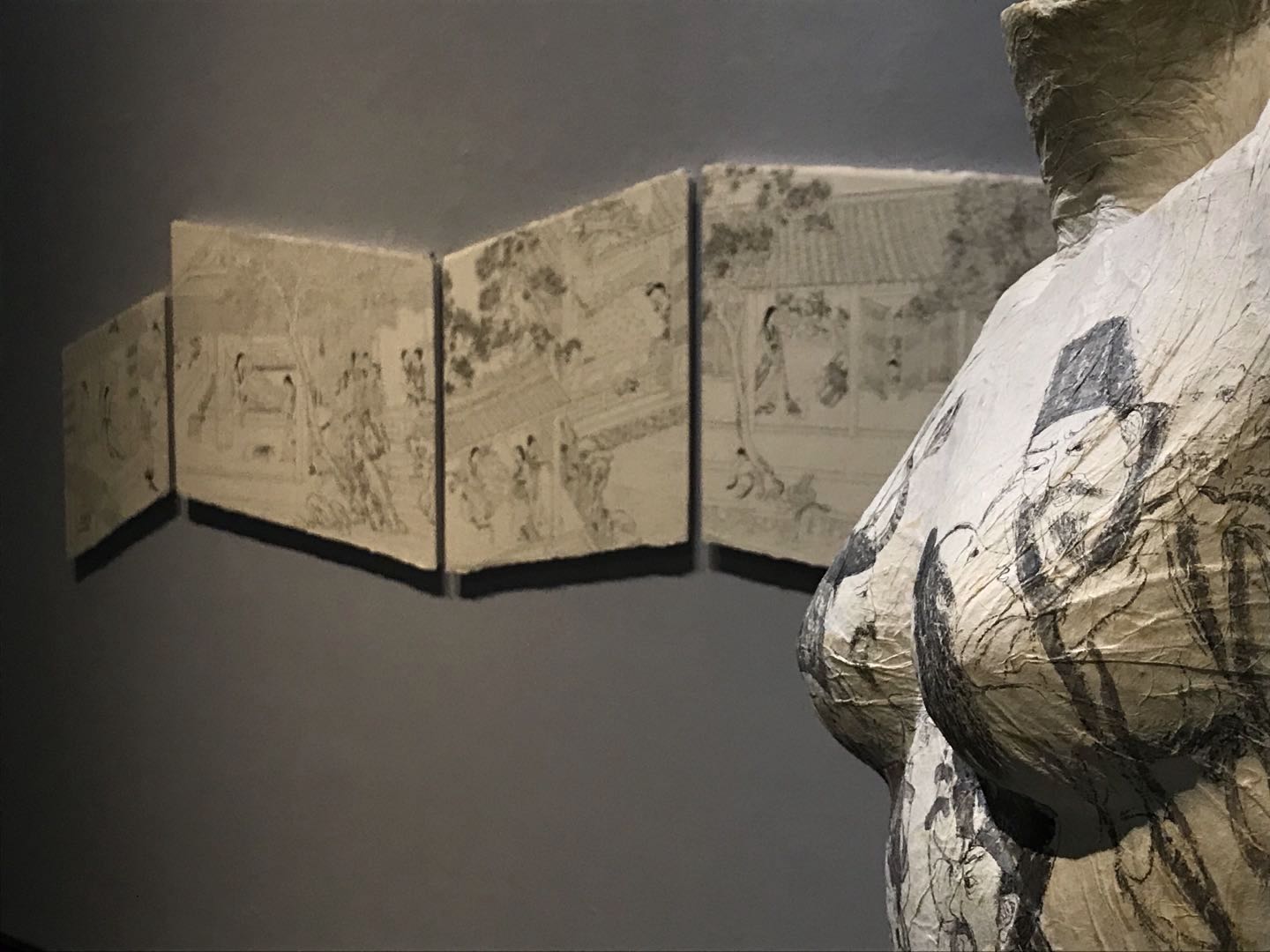 現在、広東美術館で行われていた彼女の個展『女性空間Feminine Space』には、新型コロナウイルスの自粛期間に創作した作品なども含めた近年の代表作が展示されています。特に目を引くのは、壁から飛び出すような、あるいはヴェネチアで見る孤独な彫刻のような、『Hi-Ne-Ni(ヘブライ語で「私はここにいる」の意)』という作品です。マネキンを麻紙で覆い、そこに密画の画法で物語を刻んだこの作品について、彼女はこう語っています。「食物や水はどのようにして血肉になり、皮膚はどのように痛みと喜びをもたらすか。死から生まれ変わるように、人々は毎日どのように夢から目覚めるのか。この体躯に深く入り込むことで、日常の普遍的な出来事の中にある隠喩や奇跡を体感できます」