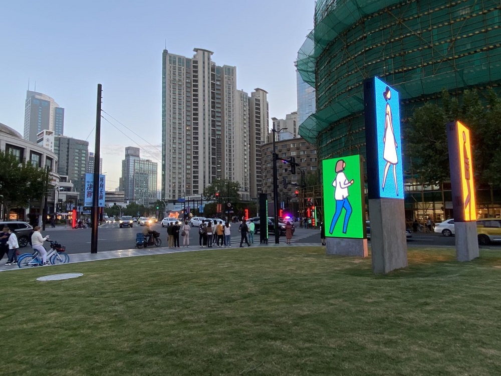 南京西路(ナンチンシールー)と石門一路(シメンイールー)の角には「STARBUCKS Reserve ROASTERY」ができて以来、インターナショナルな雰囲気になりました。「Lisson Gallery」は、ジュリアン・オピーのスクリーンアニメによる作品をこの街角に設置。「世界の主要都市でよく見られるこれらのイメージは、表象の性質や知覚表現を探る作家自身のこだわりを反映しています」と、ギャラリーのオーナー。3つのキャラクターはロンドンやニューヨークの街でも休みなく歩いているかもしれませんが、今ここ上海の交差点でも多くの人の目を引きつけています。
