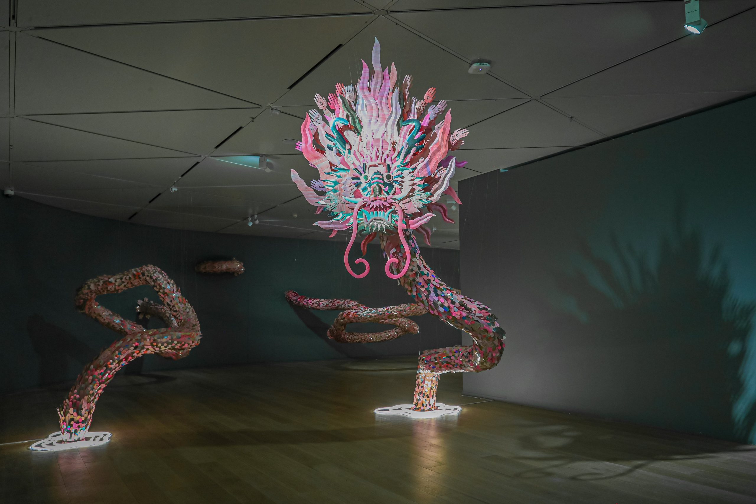 ピンクをビジュアルの基調とした彼女の作品は、視覚的なプレゼンテーションで知られる草間彌生を連想させます。龍の鱗をよく見ると、小さく伸ばした手や、目が入った手のひらなど、各パーツが精巧な切り絵になっているのがわかります。龍の関節を「点」とし、その点から無限の可能性をもつ「線」を形成し、絶え間なく続くしなやかな転回を表現。「∞」を分母にした1から始まる数字が龍の各関節に表示されています。