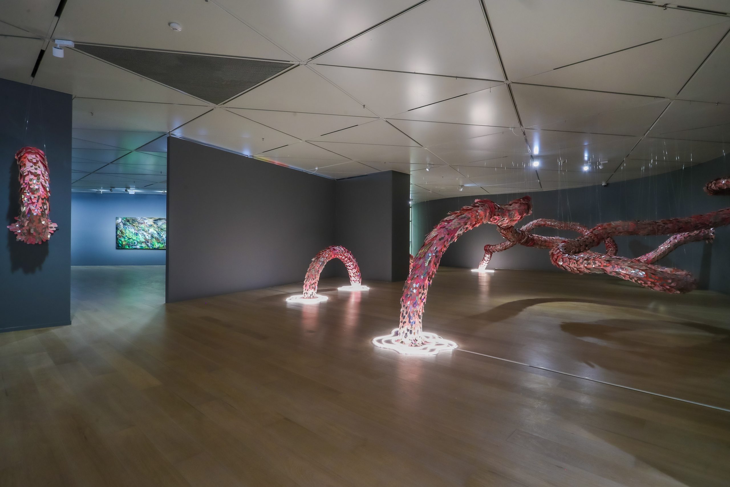 迎えるは巨大な龍。それは空を舞い、ときに壁に隠れ、ときに柱をグルグル巻きにしています。中国あるいはアジアの文化において龍は、さまざまな作家によって多様な解釈が行われていますが、紙を使うアーティスト陳粉丸(チェン・フェンワン)のこの龍のタイトルは『Infinite』。面白いのは、今回、上海明珠美術館に展示されたこの作品が、2年前に広州で最初に展示されたときと比べて3倍の長さになっているところです。