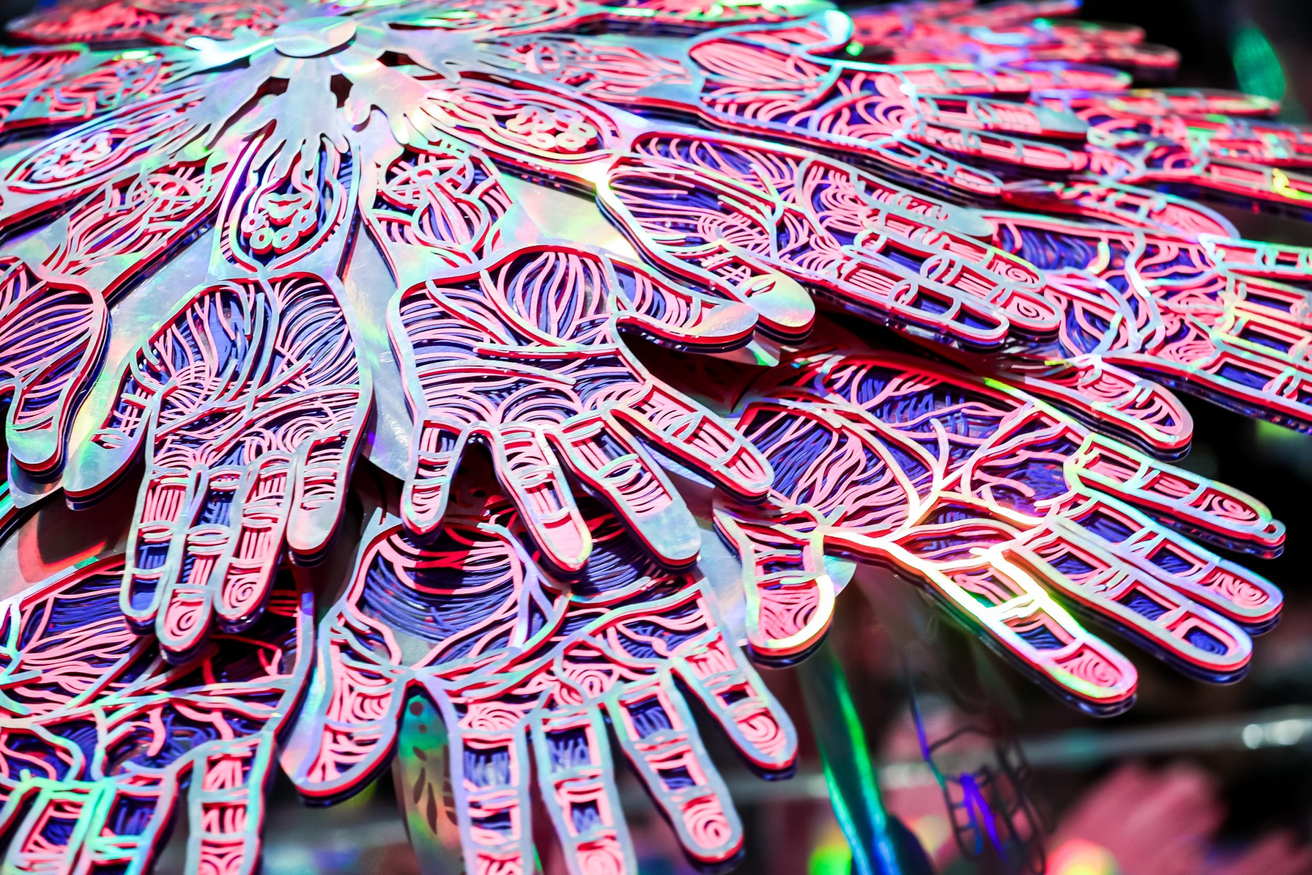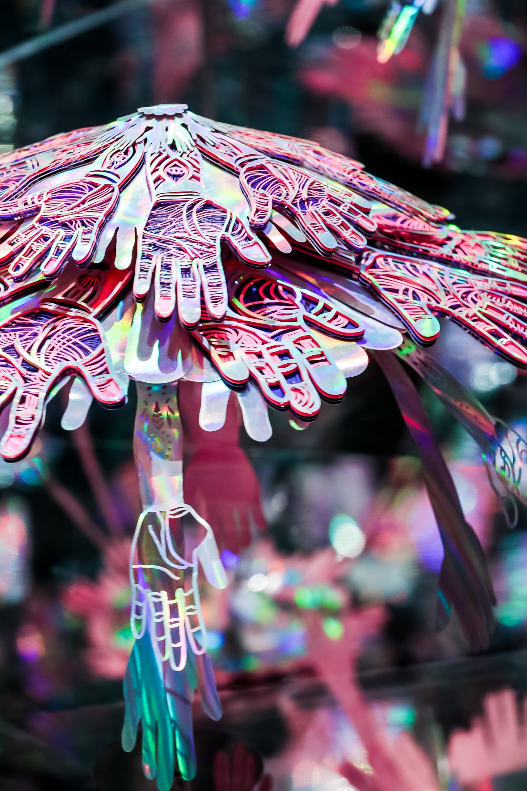 そして光沢のある紙を使って切り抜いた手のひらを組み合わせ、奇異な花をつくり、機械で回転させ、六面鏡の室内に無限にその花が反射するサイケデリックな空間を完成させました。まさに草間彌生の『無限の鏡の間』を彷彿とさせます。