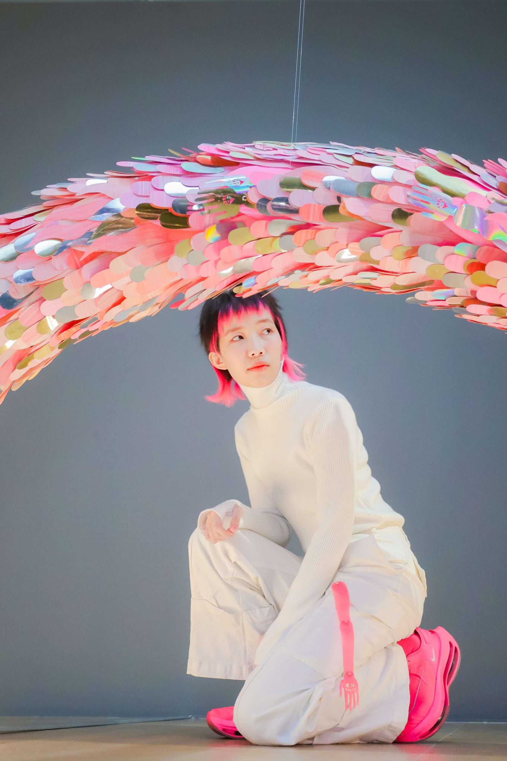 「これは絶え間なく拡張する作品です。展示の度に少しずつ長くなっていくのは、私の頭の中にある龍の神秘性を表しています」と話すチェン・フェンワン。トレードマークでもあるピンクのメッシュに、ピンクのスニーカーを履き、コロナ禍のマスクもピンクのグラデーションカラー。華やいだ雰囲気を感じさせてくれます。