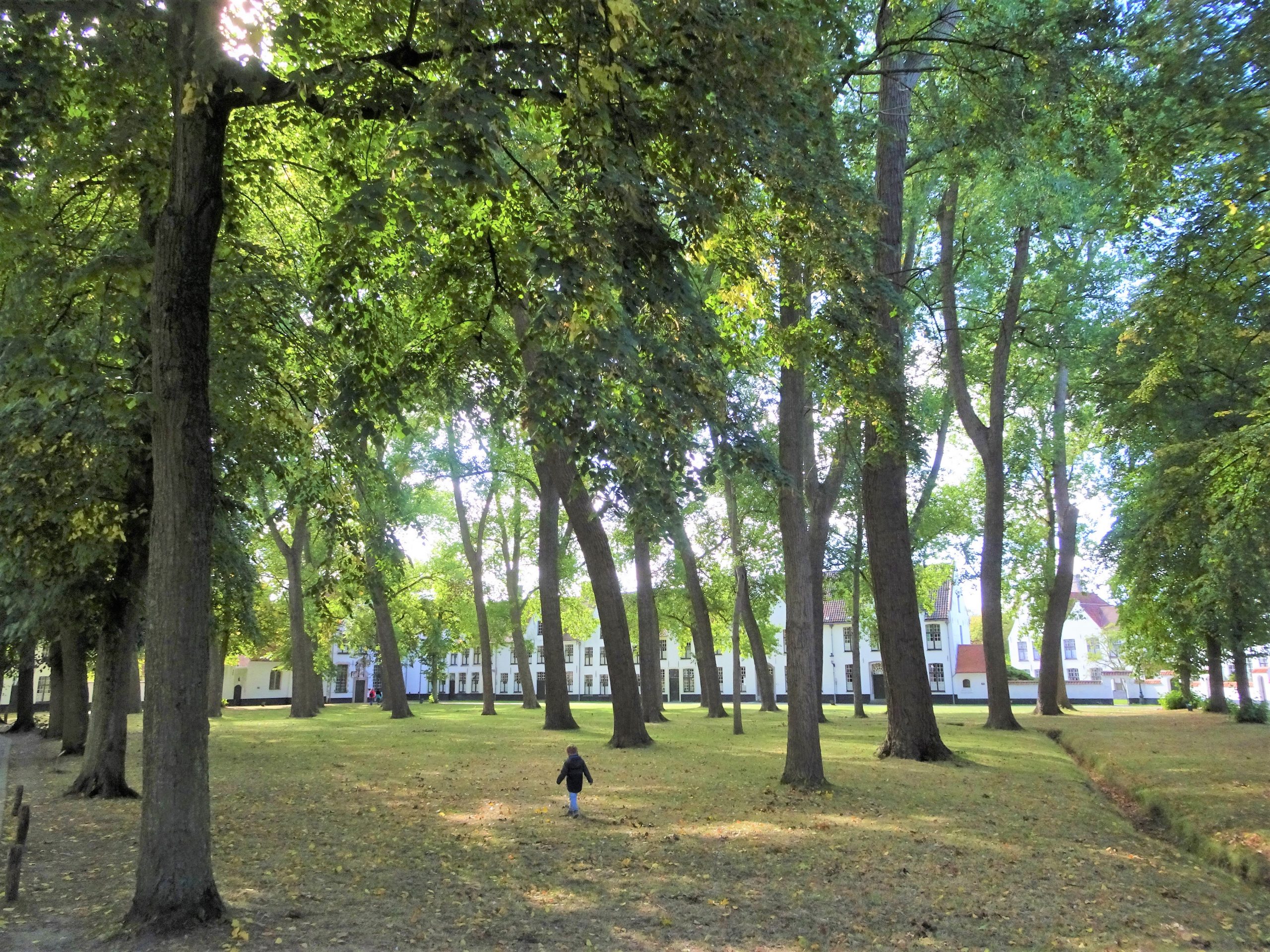 するとそこには、さやさやささやく、明るいポプラの林が広がっていました。樹々に守られるように、林のむこうに端正なたたずまいを見せるのは、ブルージュのベギンホフ(Begijnhof、ベギン会修道院)。