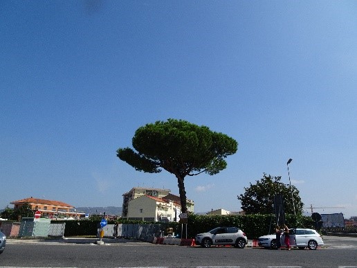 遠くからでもとても目立ってイタリアらしい風景をつくり上げている、存在感のある樹です。その姿は街なかでも、空港前の広場でも、いろいろな場所でランドマークのように見かけられます。