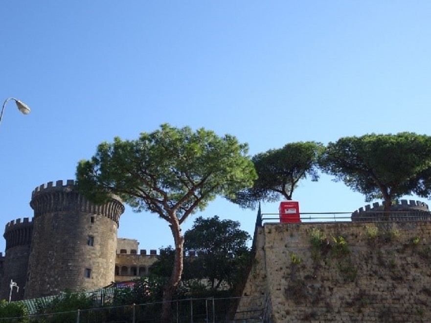 ナポリの港に近い王宮の壁の上にも、イタリアカサマツが背伸びしているみたいに見えていました。