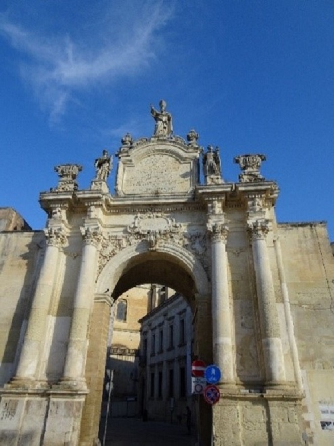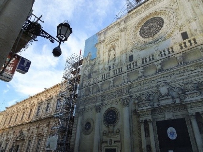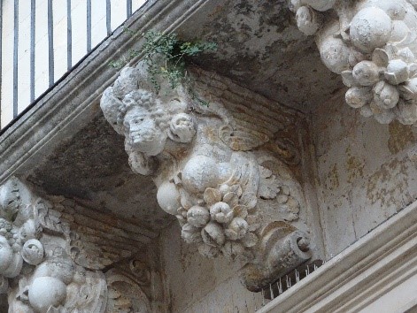 現存する華やかな彫刻のある建築は、時代がくだって16~17世紀頃につくられたものです。レッチェ石と呼ばれる柔らかな石灰石が使われていて、これでもか!というほどの、細かい彫刻を可能にしています。