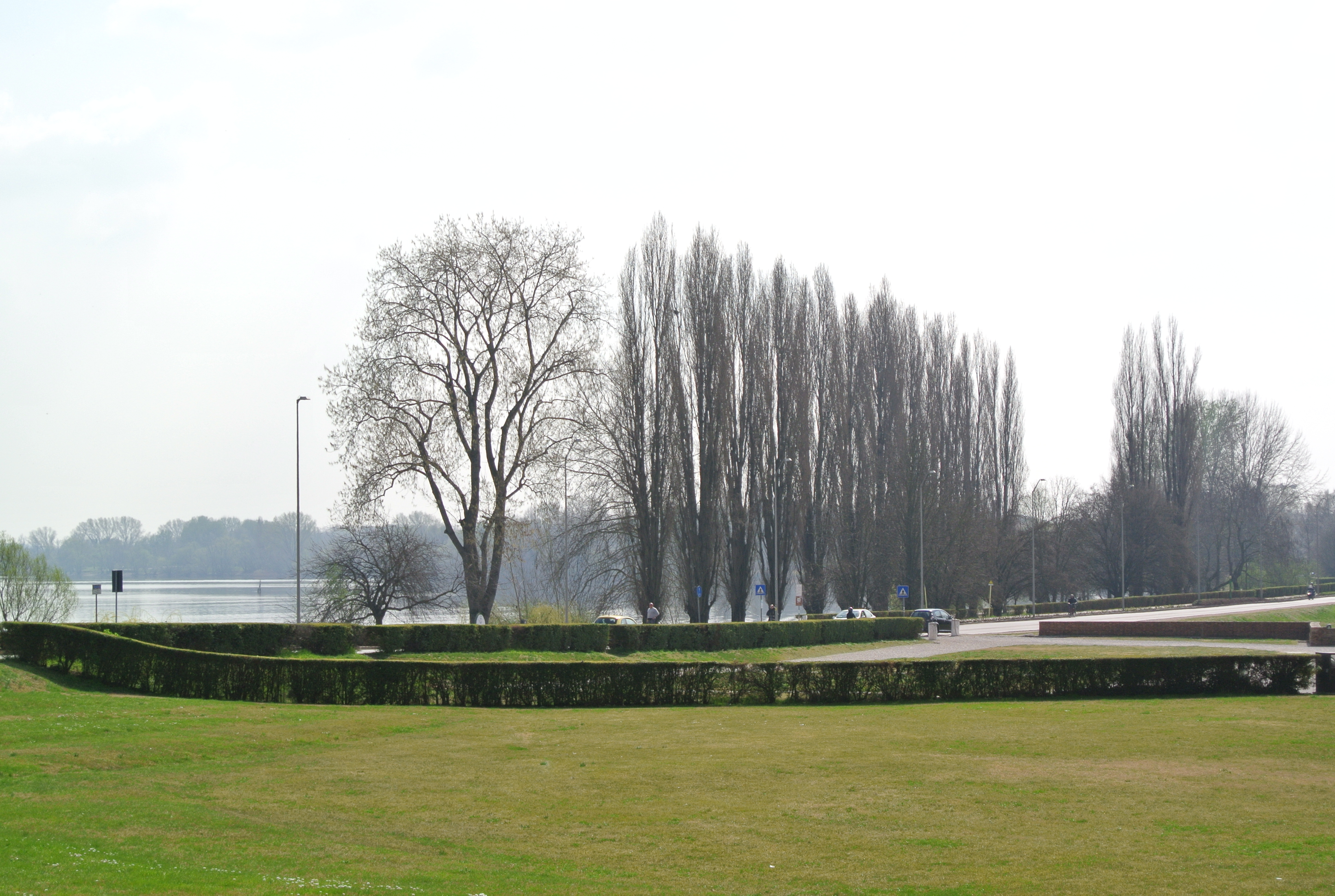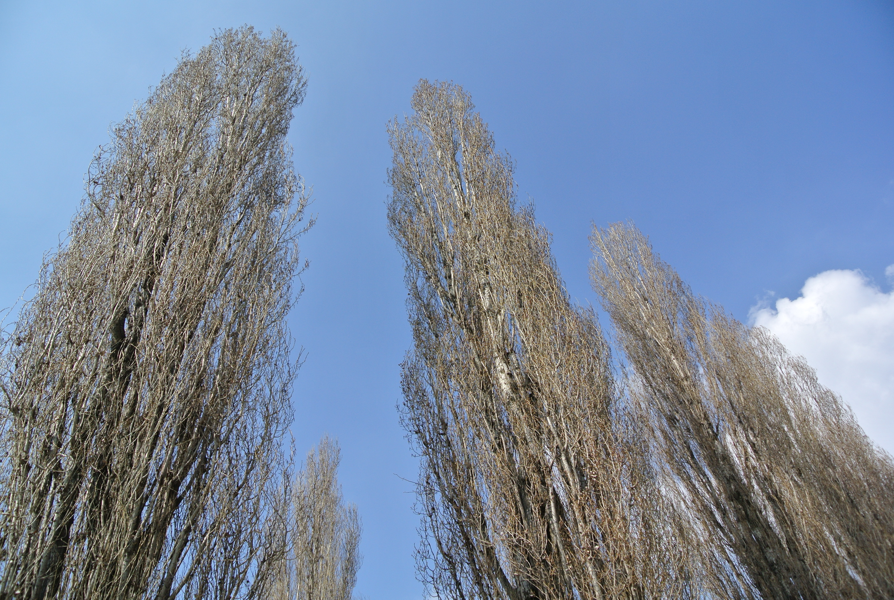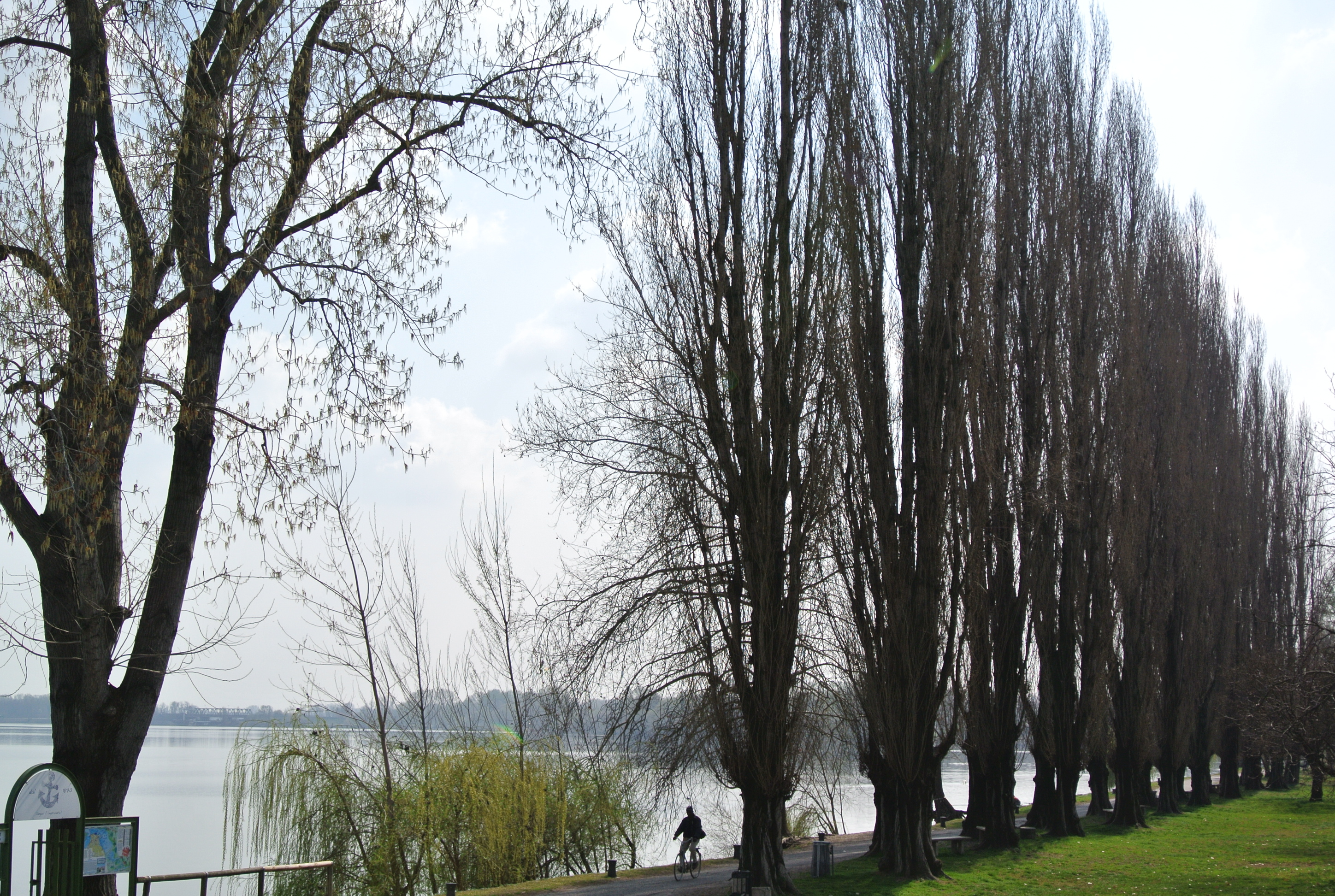 この街は、三方を湖で囲まれています。いずれも人工湖で、湖面は穏やかです。そのほとりに出ると、ポプラの並木が続いています。このときは春分でした。春の訪れに樹木が目覚めて、芽吹きはじめる頃です。枝先が、一番きらきらきらめく頃です。