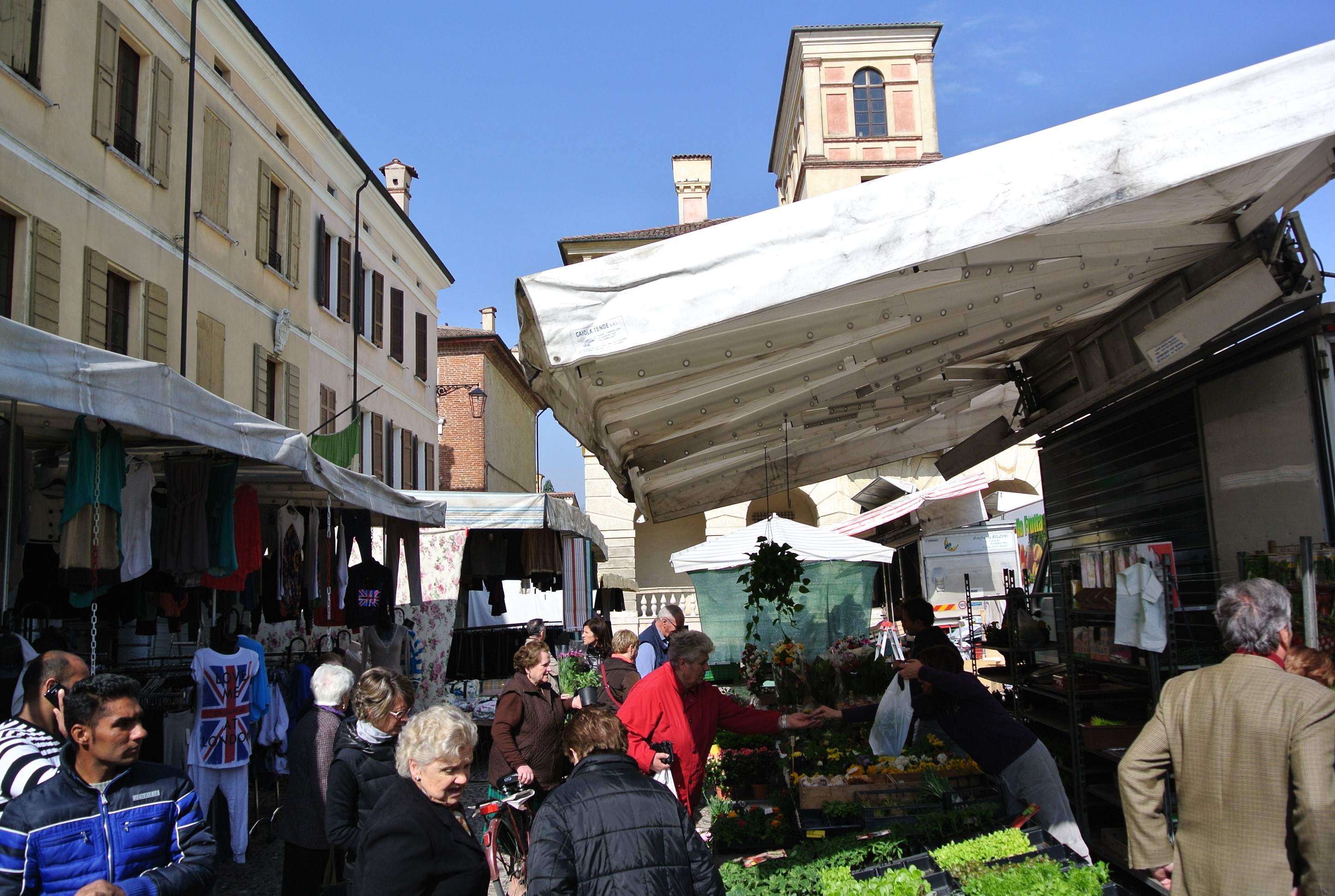 宮殿の前広場には、市がたちます。クレモナ、マントヴァ、サッビオネータはいずれも、北イタリアのポー川流域の肥沃な土地です。豊かな野菜や果物が市場に並びます。花屋にはマーガレットやラヴェンダーやカメリアなどの花々、ズッキーニやトマトやルッコラなど野菜の苗もありました。おもちゃや衣類などの日用品や雑貨までいろいろ、パニーニなどのちょっとした食べ物などもあって、なごやかなのんびりした時間が流れます。