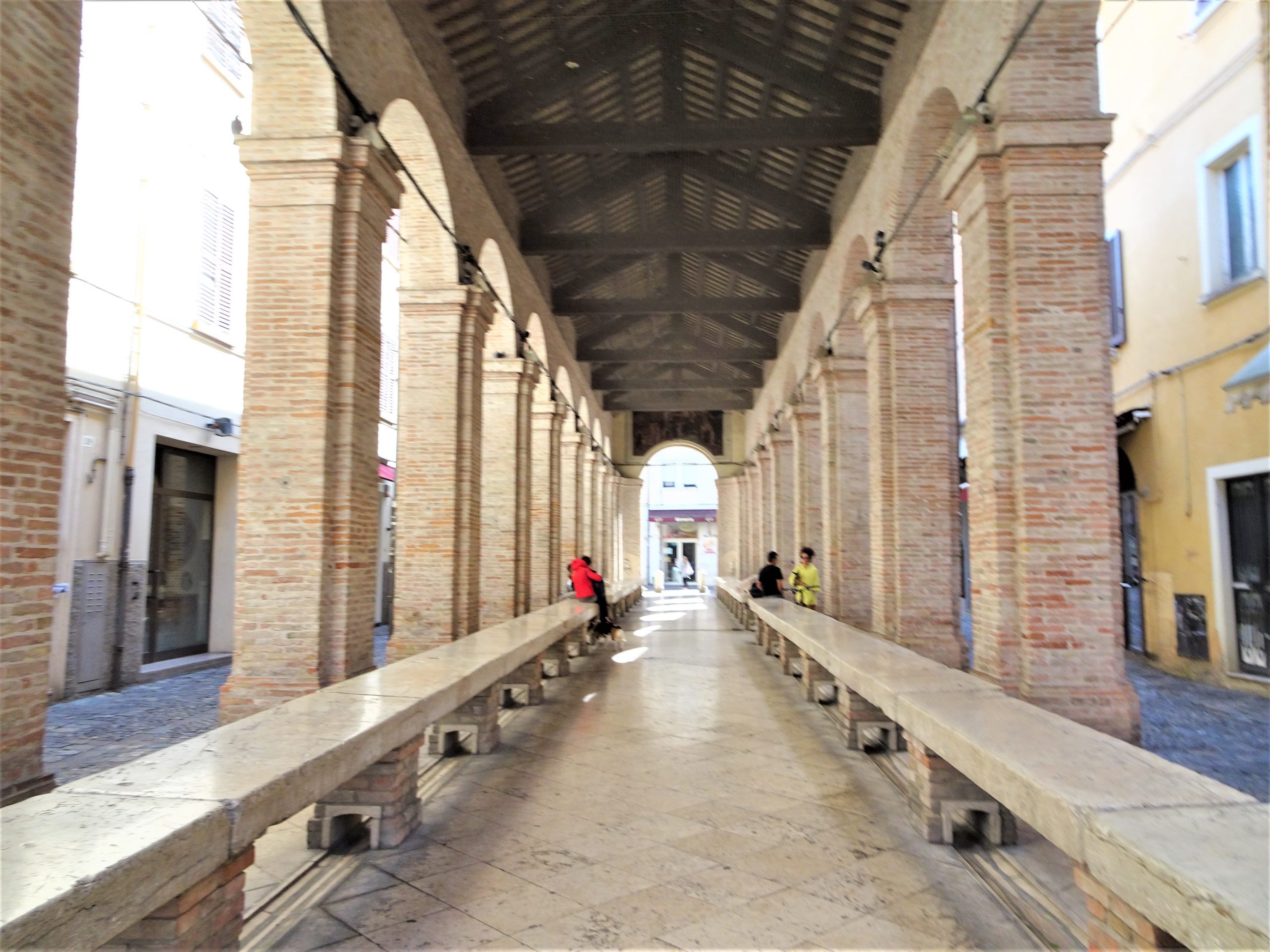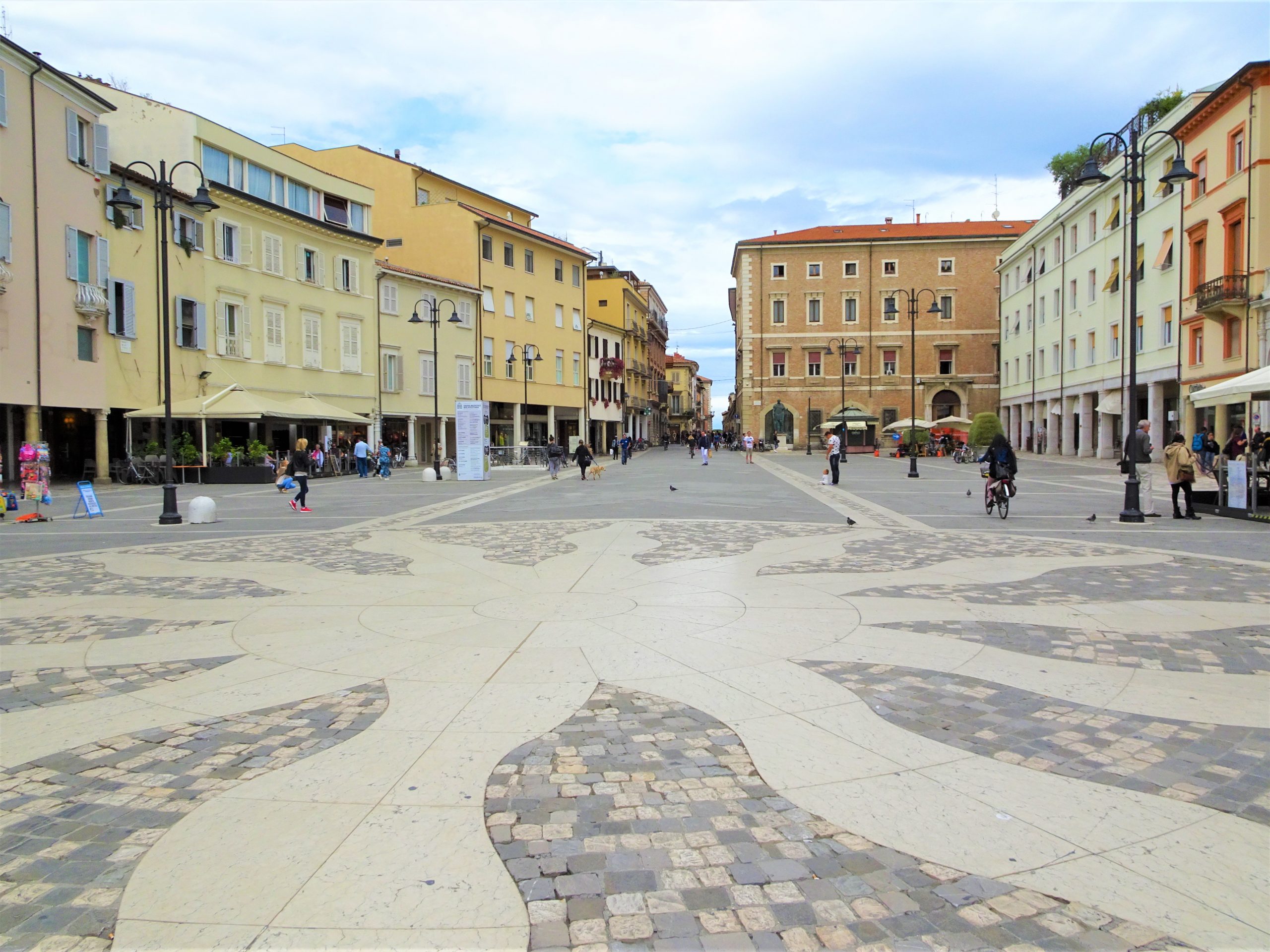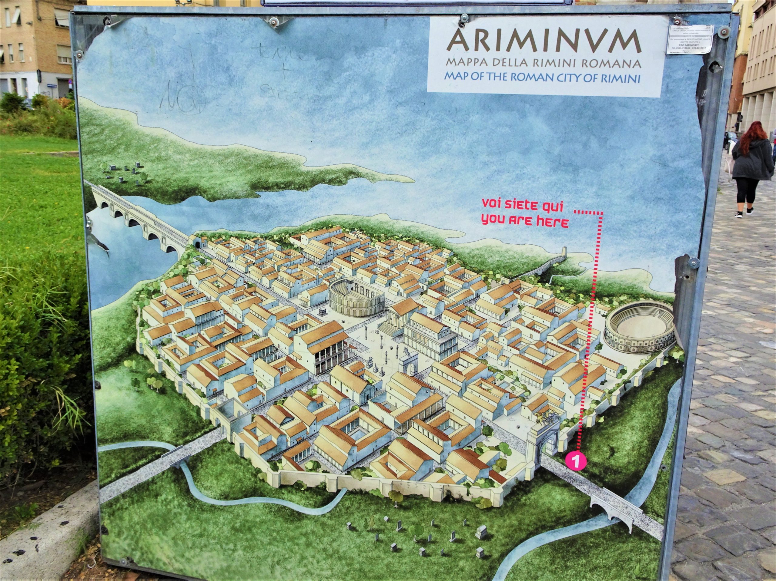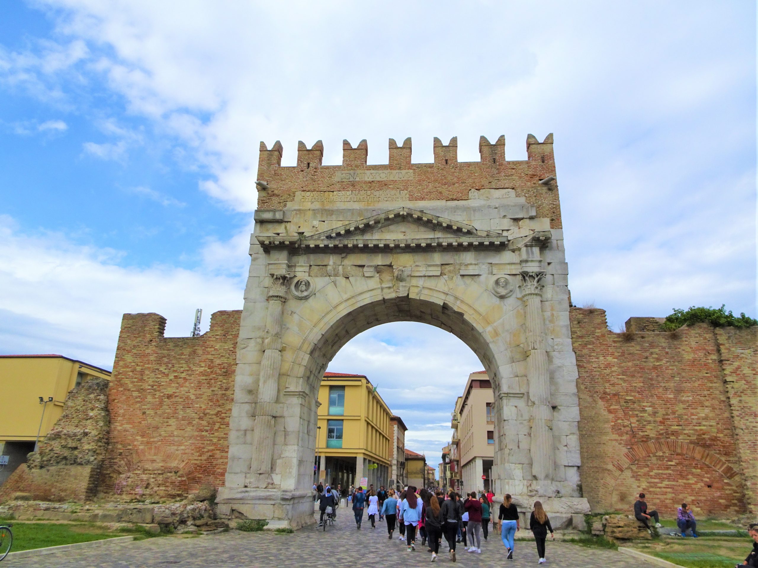 リミニはフラミニア街道の終点ですが、その場所には紀元前27年に建てられた凱旋門が残っています。これは、古代ローマ時代の現存する最古の凱旋門だそう(アウグストゥスの凱旋門 Arco d’ Augusto)。ローマとリミニはイタリア半島(アペニン半島)の西と東、半島の反対側です。その移動は、なんとも大変なことだったでしょう。