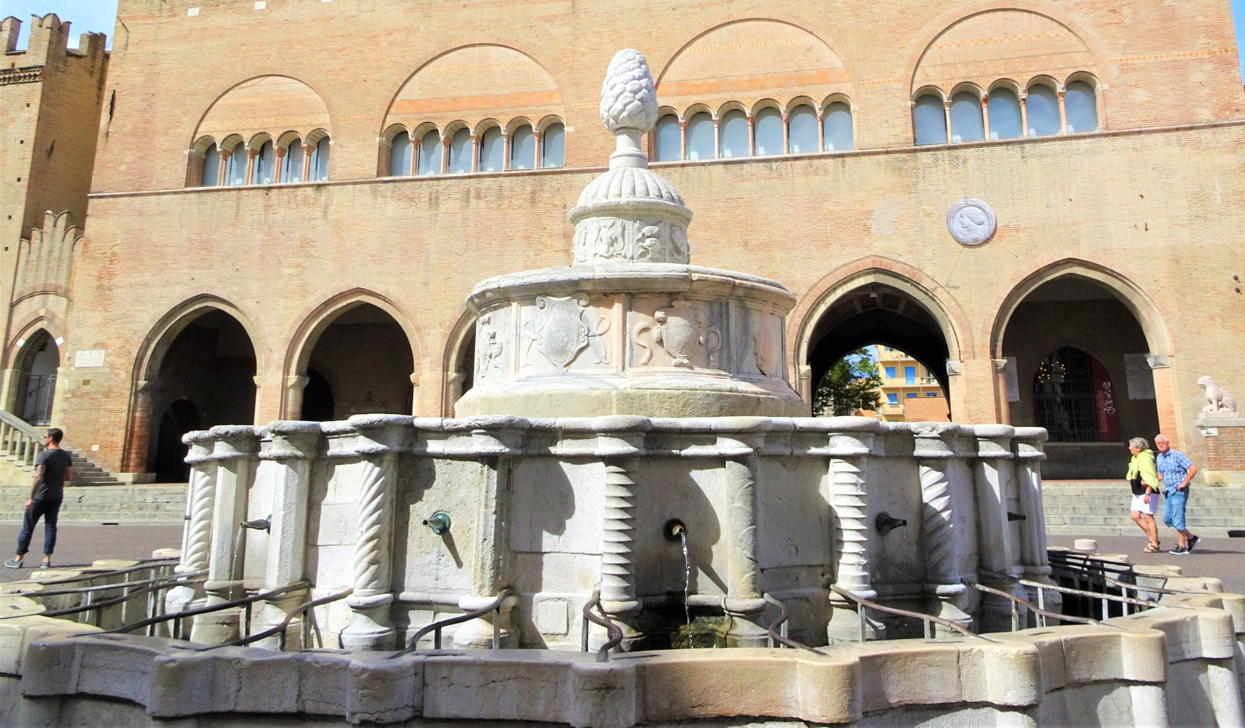 古い広場は、『フェリーニのアマルコルド』(“Amarcord”)に登場して、幾度となくバイクが猛スピードで通過したり、春を祝う祝祭にみんなが椅子やらなにやらどんどん持ってきて燃やしたり、雪に覆われた噴水へ孔雀が飛んできて、まるで凍っている噴水のかわりのように、大きく羽を広げたりする、あのカヴ―ル広場(Piazza Cavour)。(じっさいにはチネチッタに巨大なセットを組んでスタジオ撮影されたとか。それもすごい話ですが)