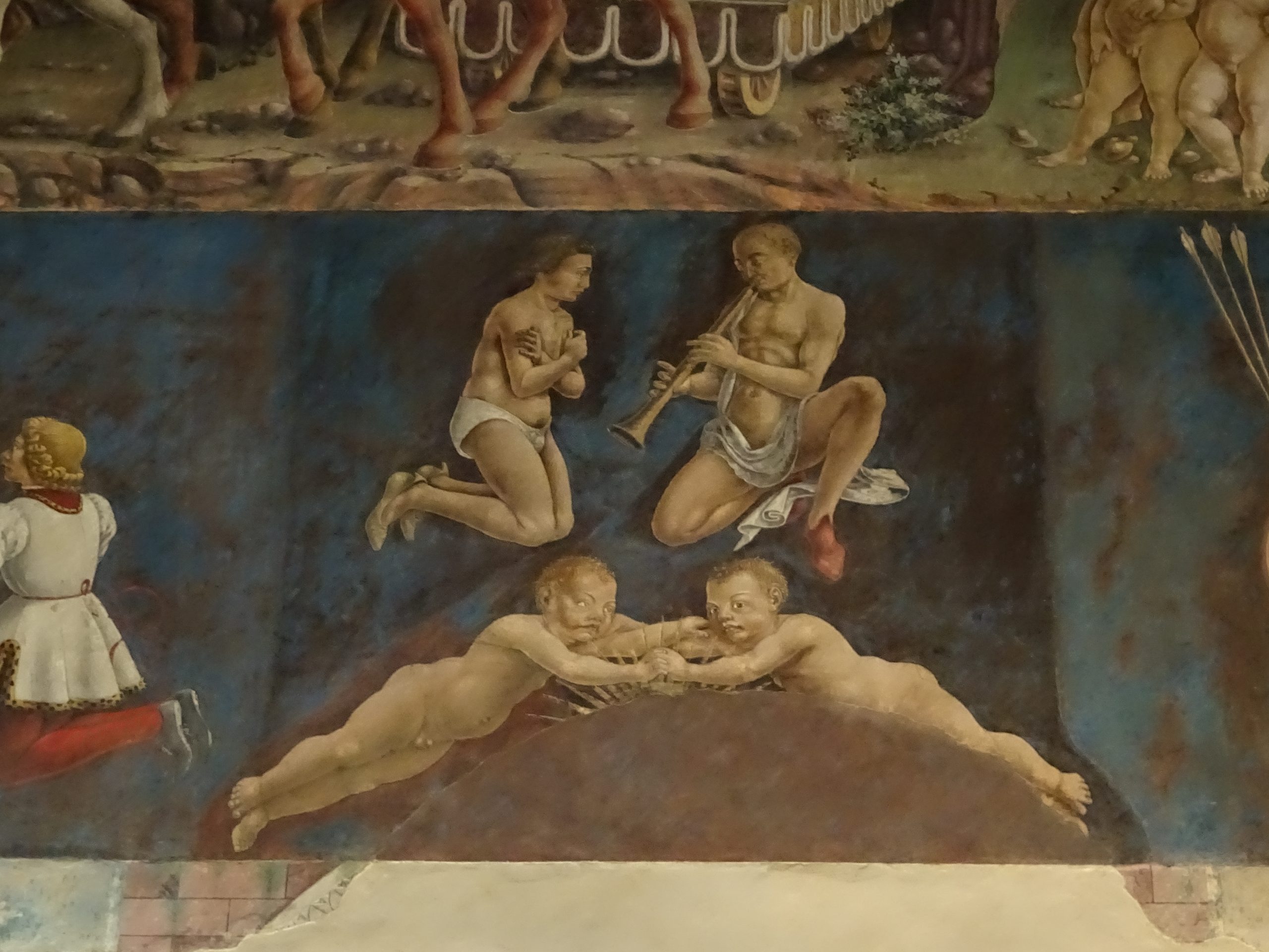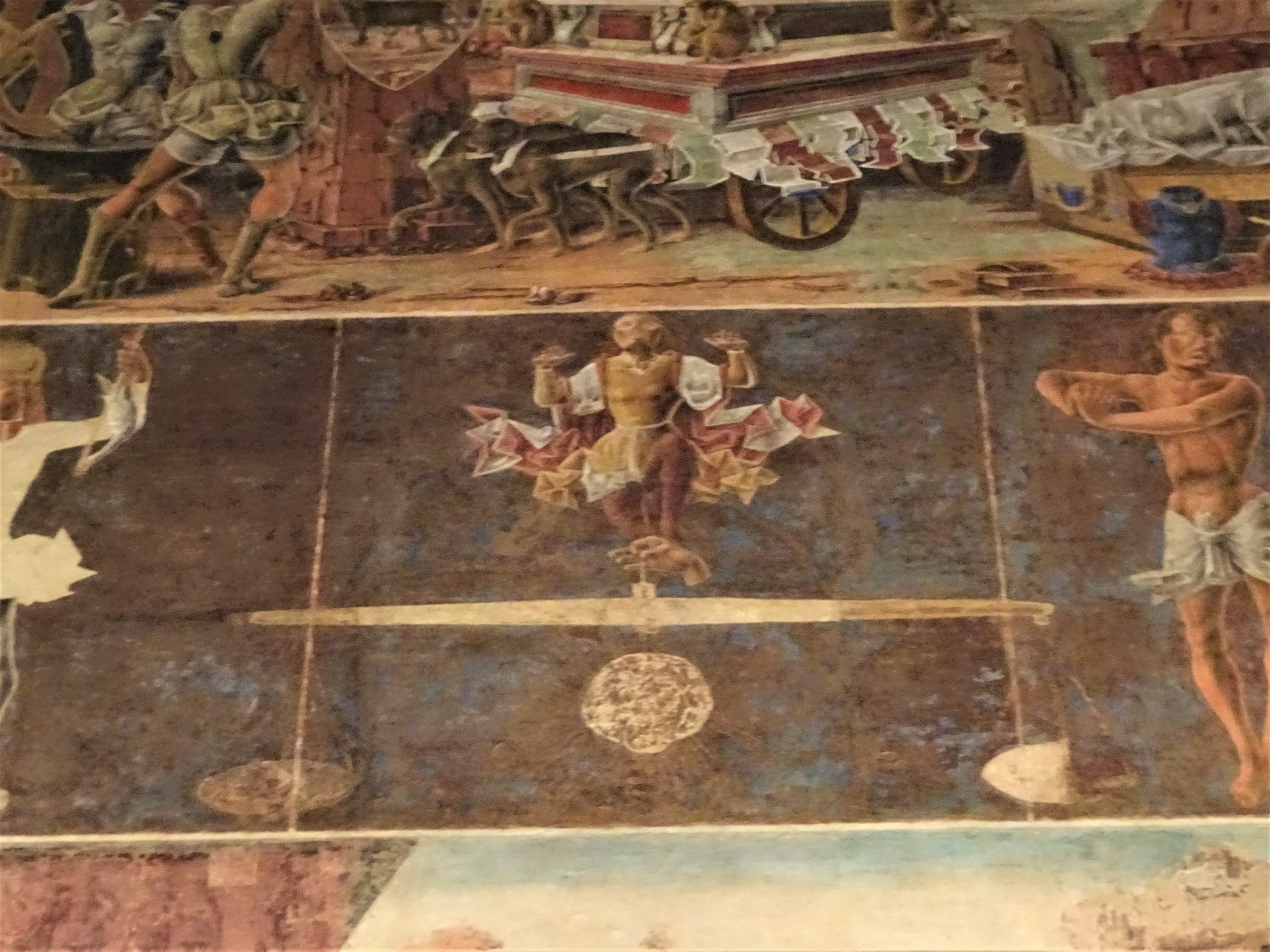 このどうしようもなく魅惑的な壁画を描かせたのは、ボルソ・デステというフェッラーラの領主。教皇からフェッラーラ公の称号を受けて、フェッラーラ公国と認められたときのお祝いでした(1470年頃の完成)。