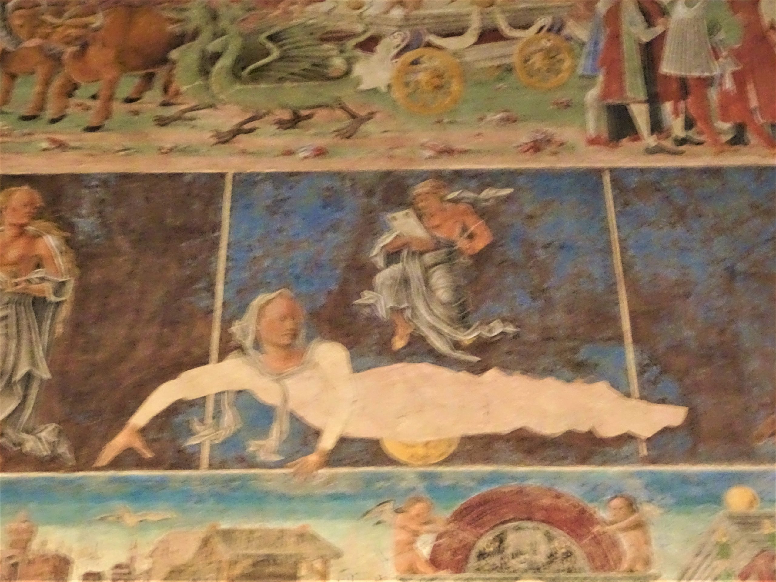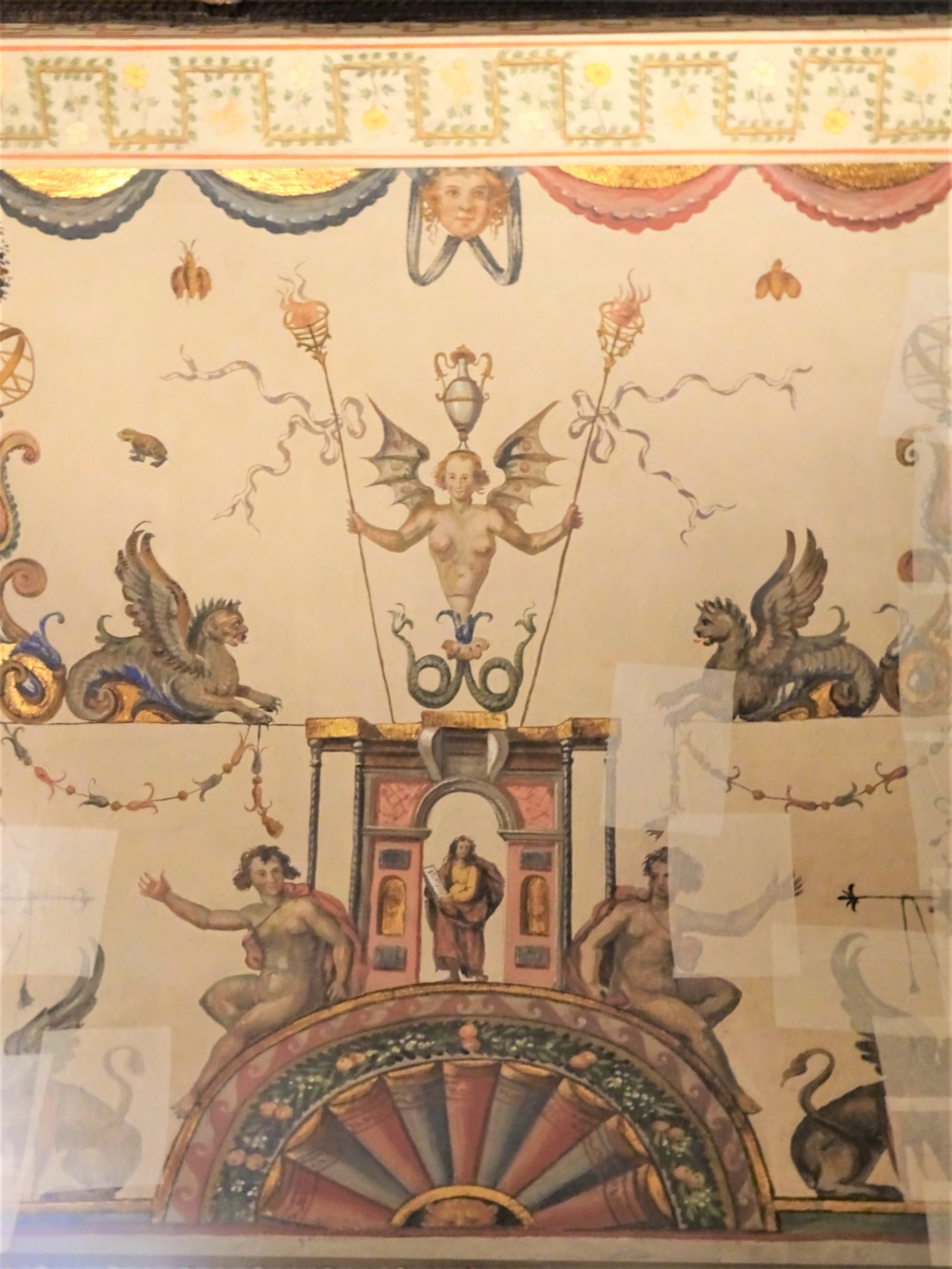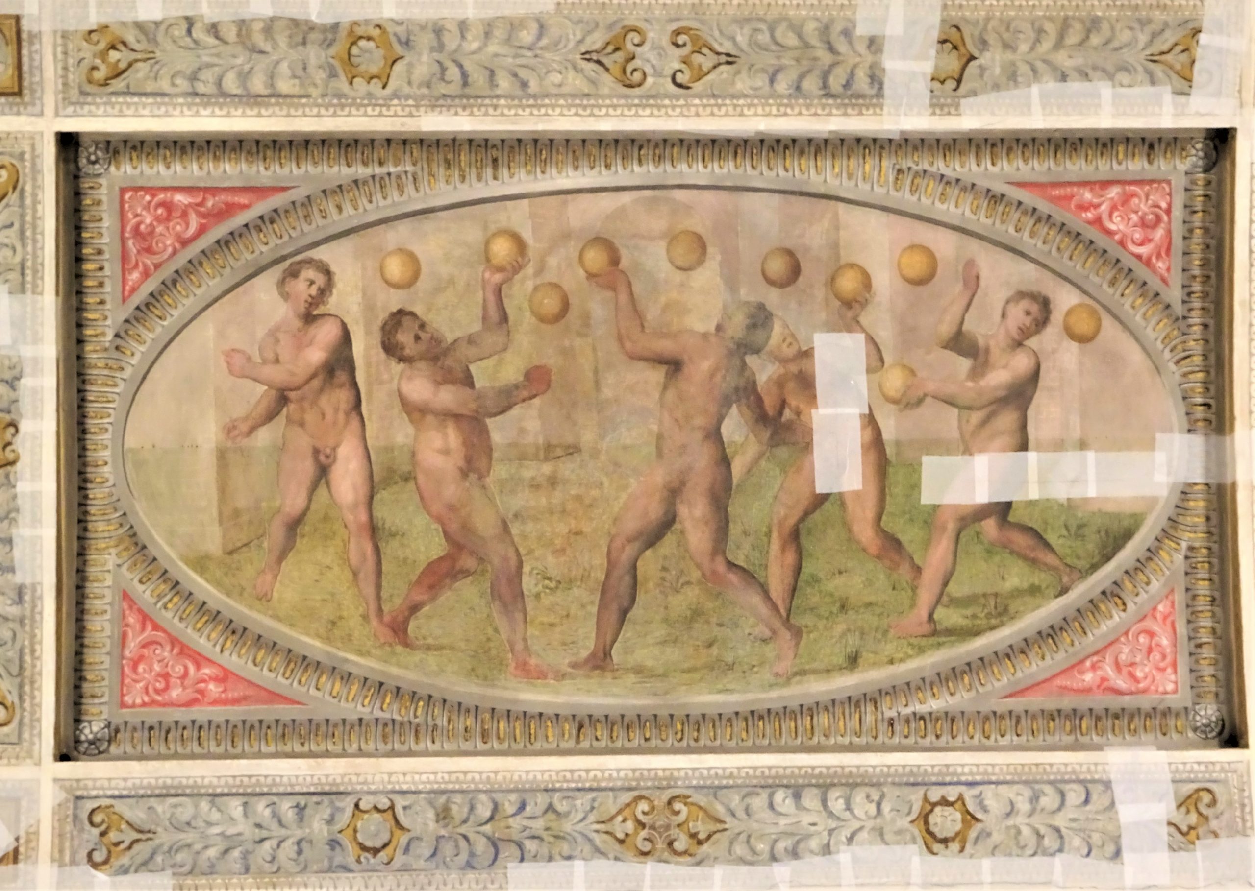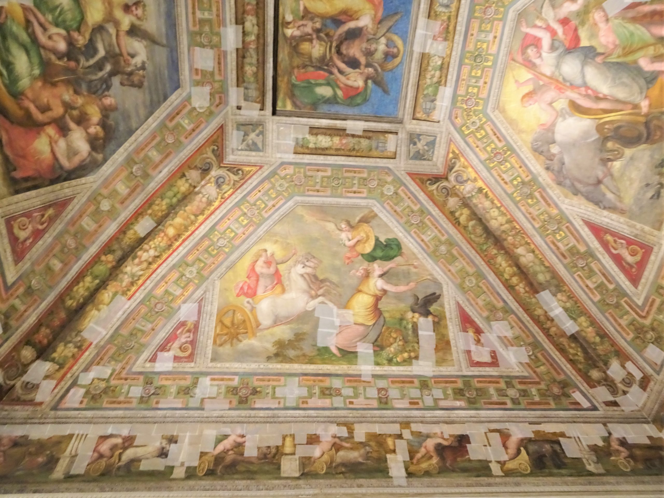 城内の壁画は趣向が凝らされていて美しい。フェッラーラは2012年のイタリア北部地震で大変な被害を受けて、エステンセ城の壁画も、あちこちに保護修復のテープが貼られているのが痛々しい。けれども豪奢な様に、ため息。