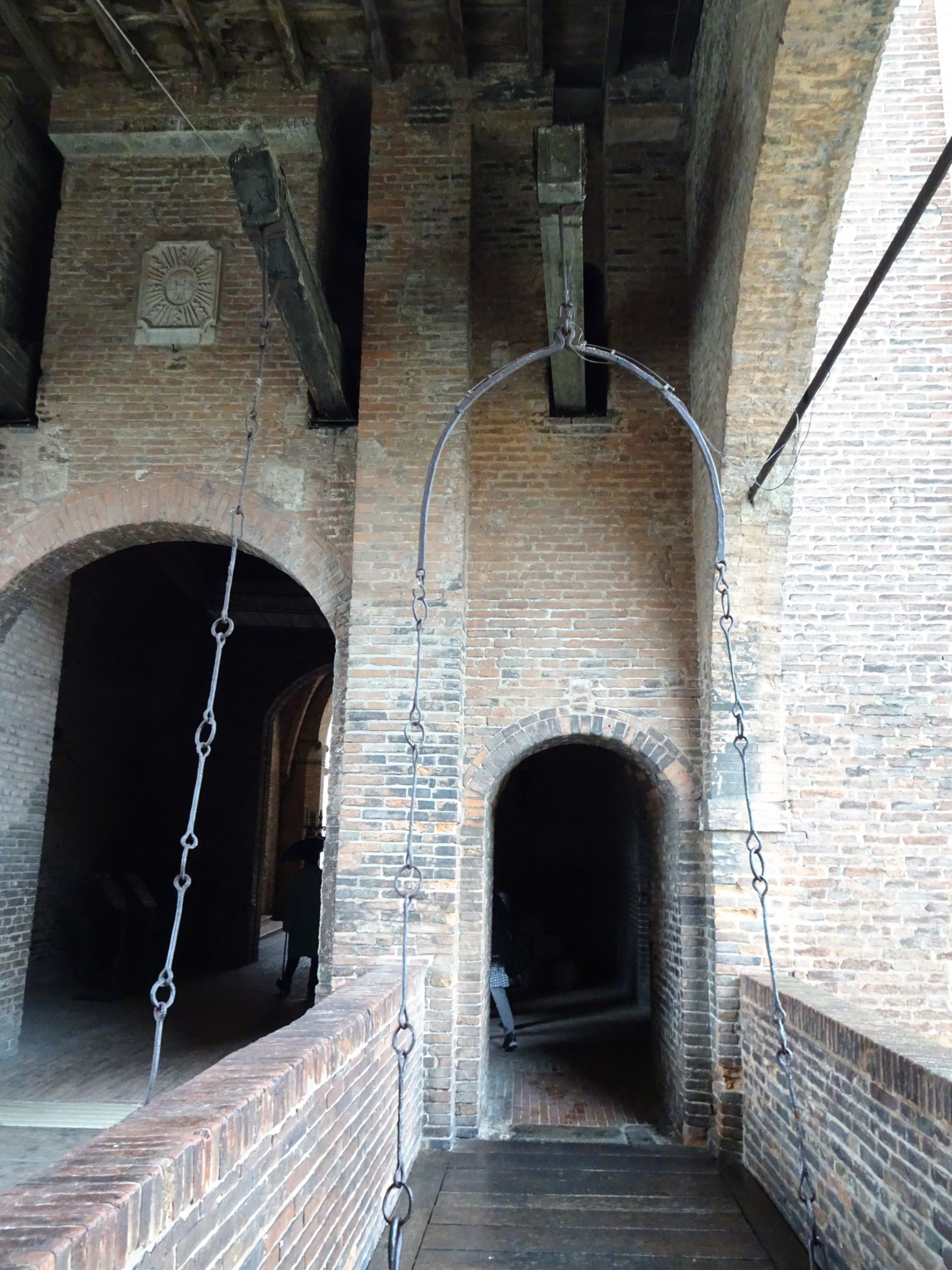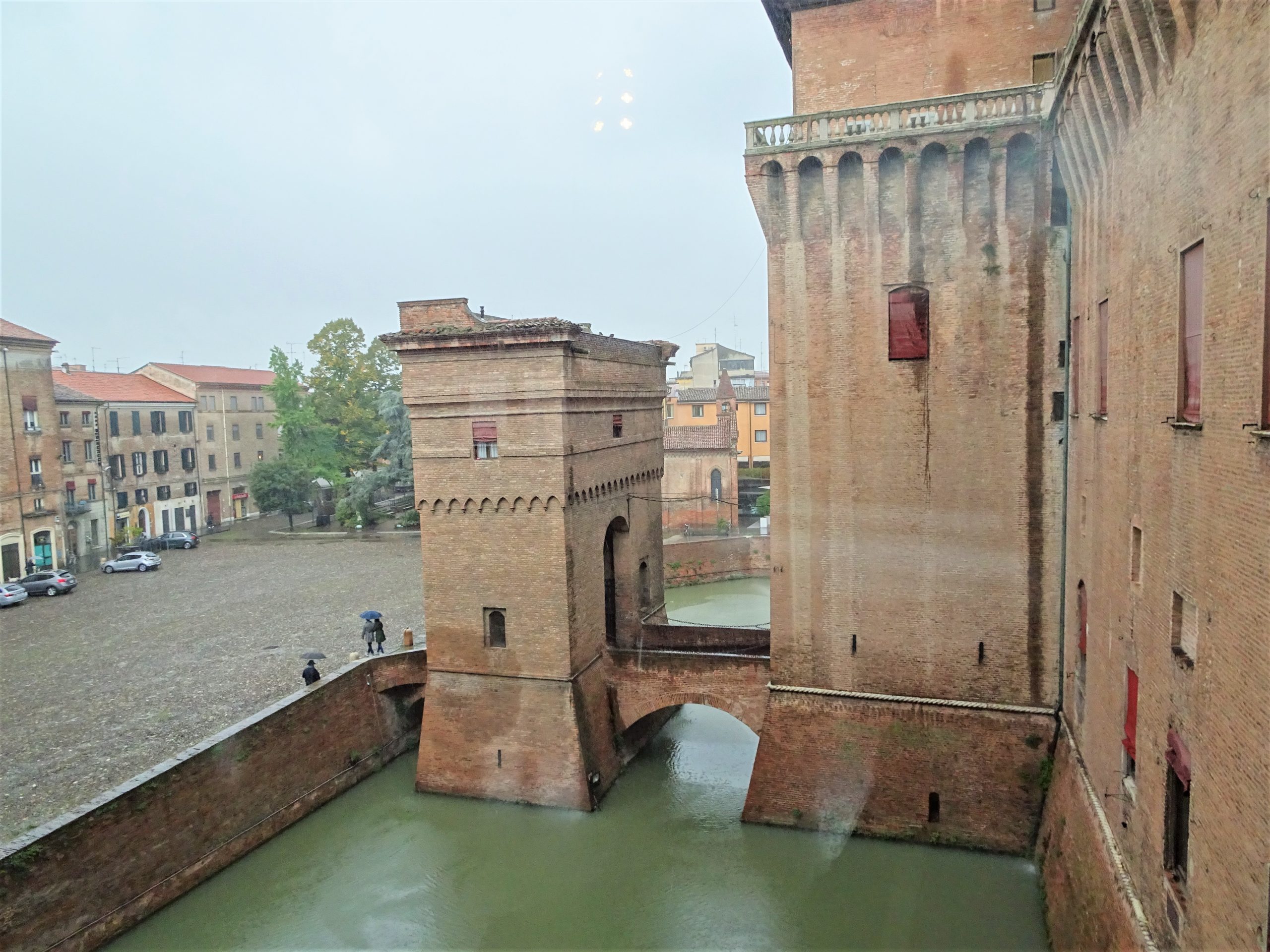 エステ家の居城であったエステンセ城(Castello Estense)は、街のほぼ中心にあります。ぐるりと水をたたえたお濠を巡らせて、跳ね橋のある、守りの堅い建物です。跳ね橋を渡るのに、ちょっと緊張します。