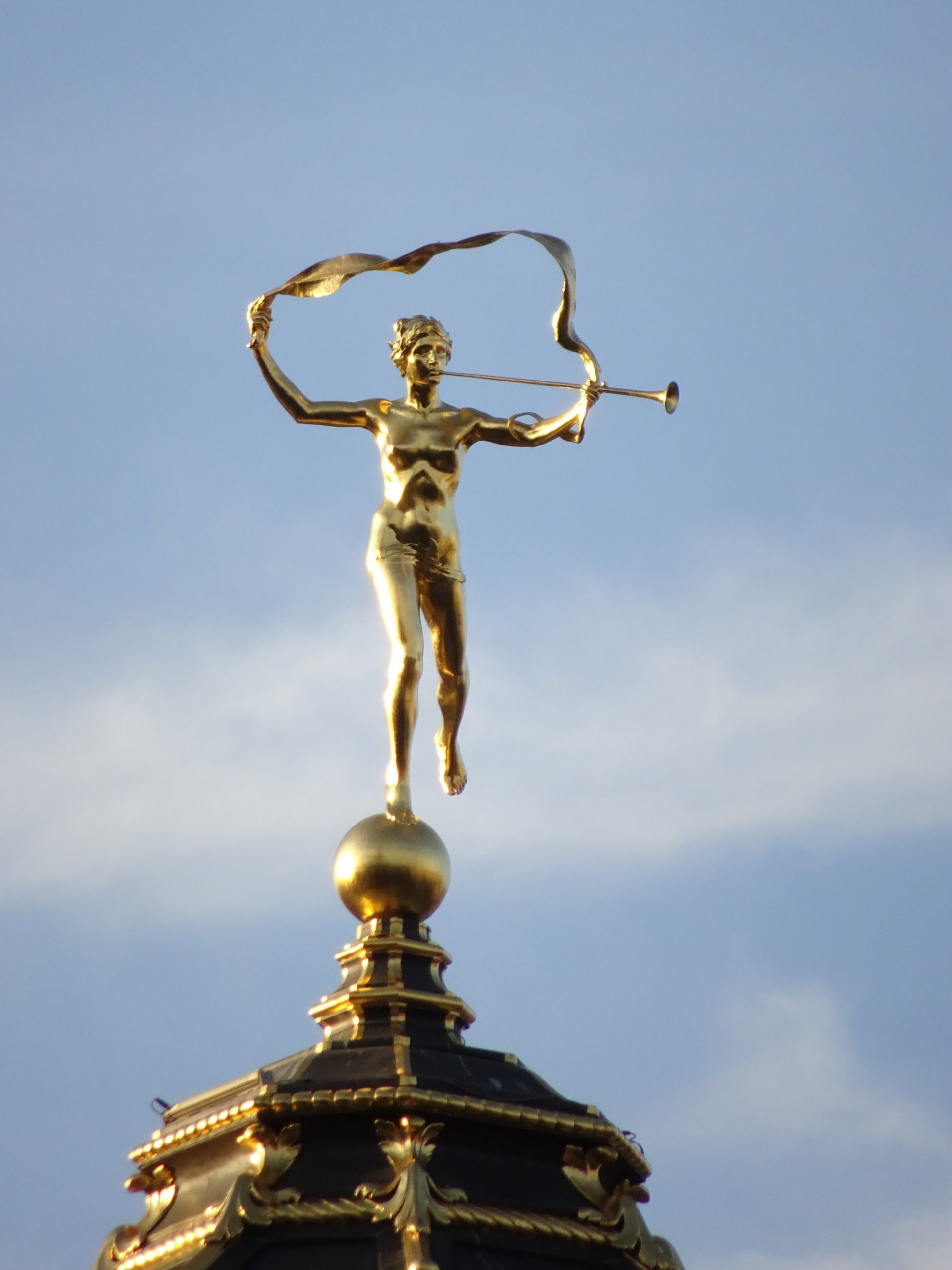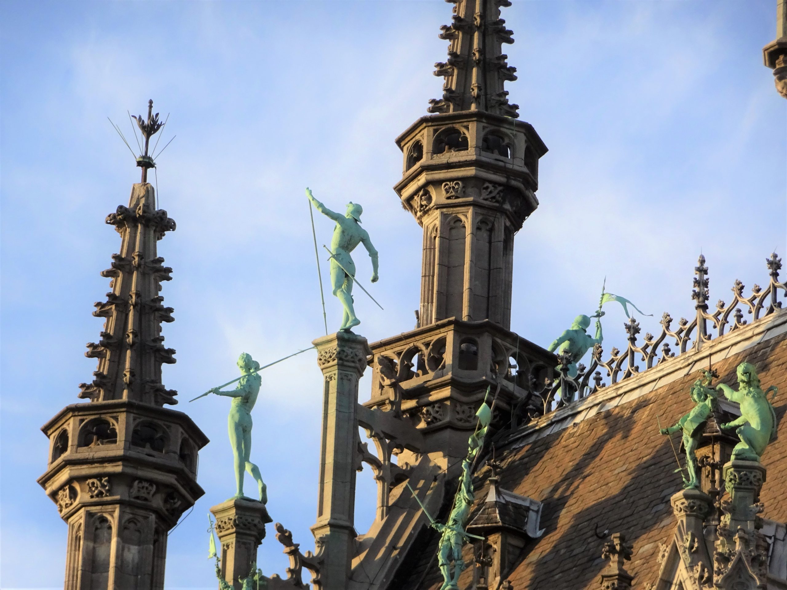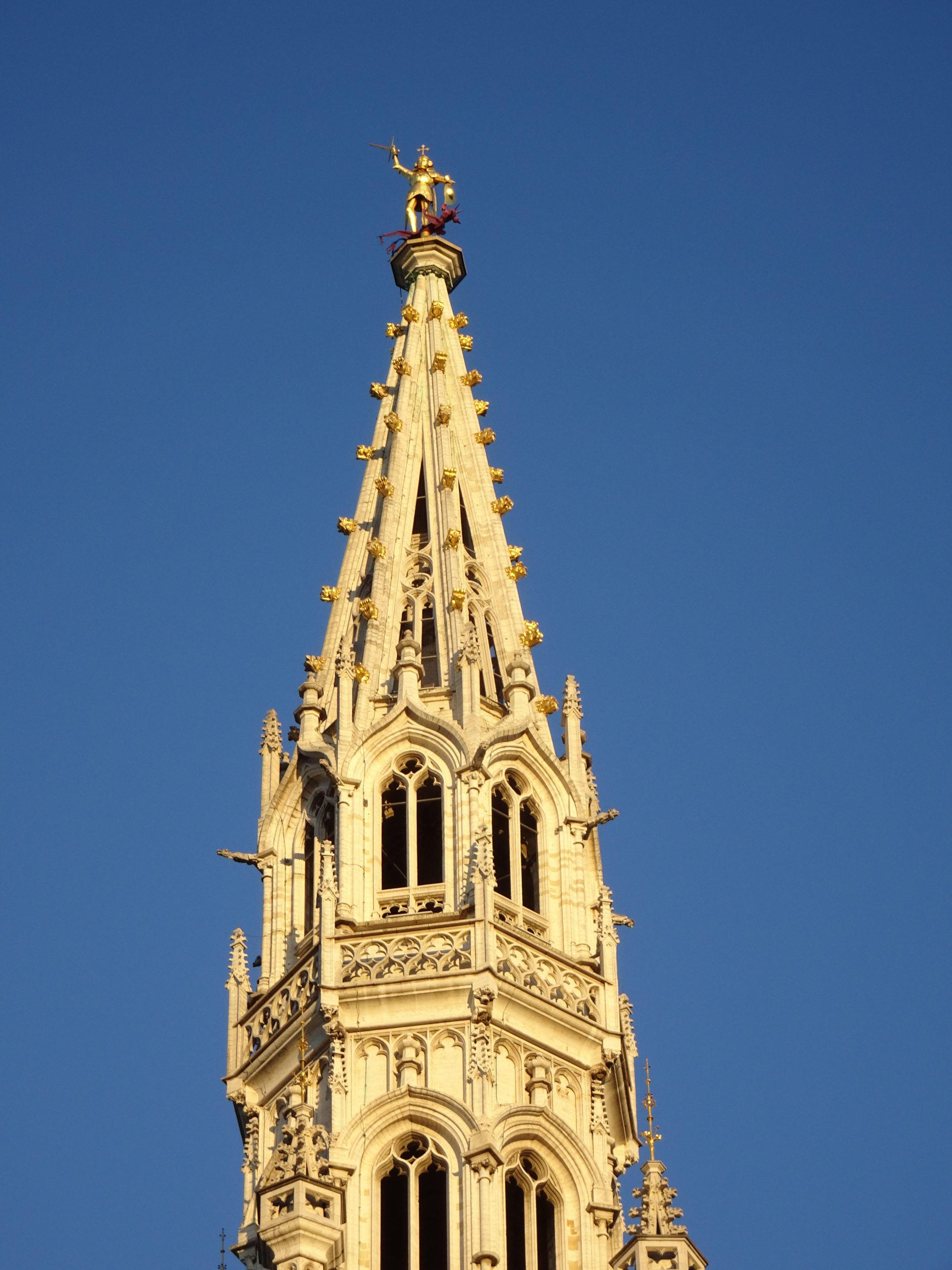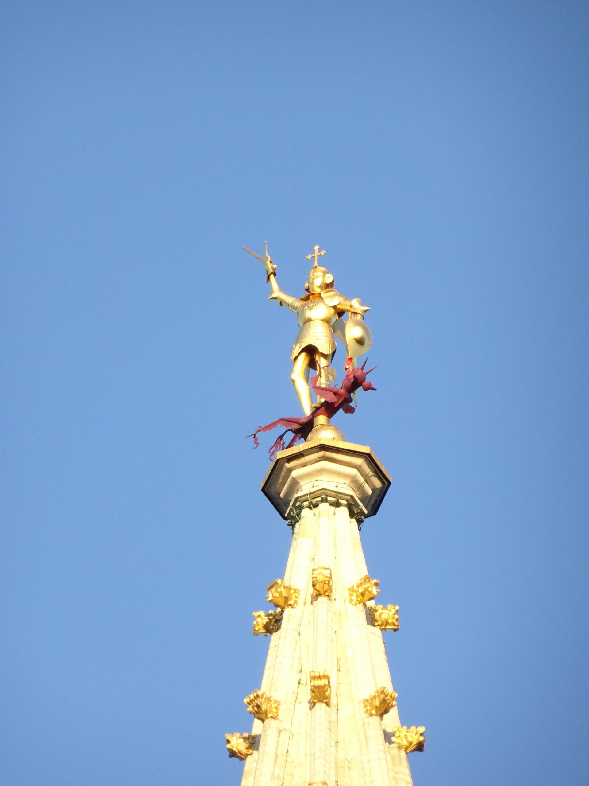 尖塔のてっぺんには、ドラゴンを退治する聖ミカエル。広場には暗く悲惨なエピソードもありますが、この都市の守護天使は、尖塔の上からすべて見守ってきたことでしょう。