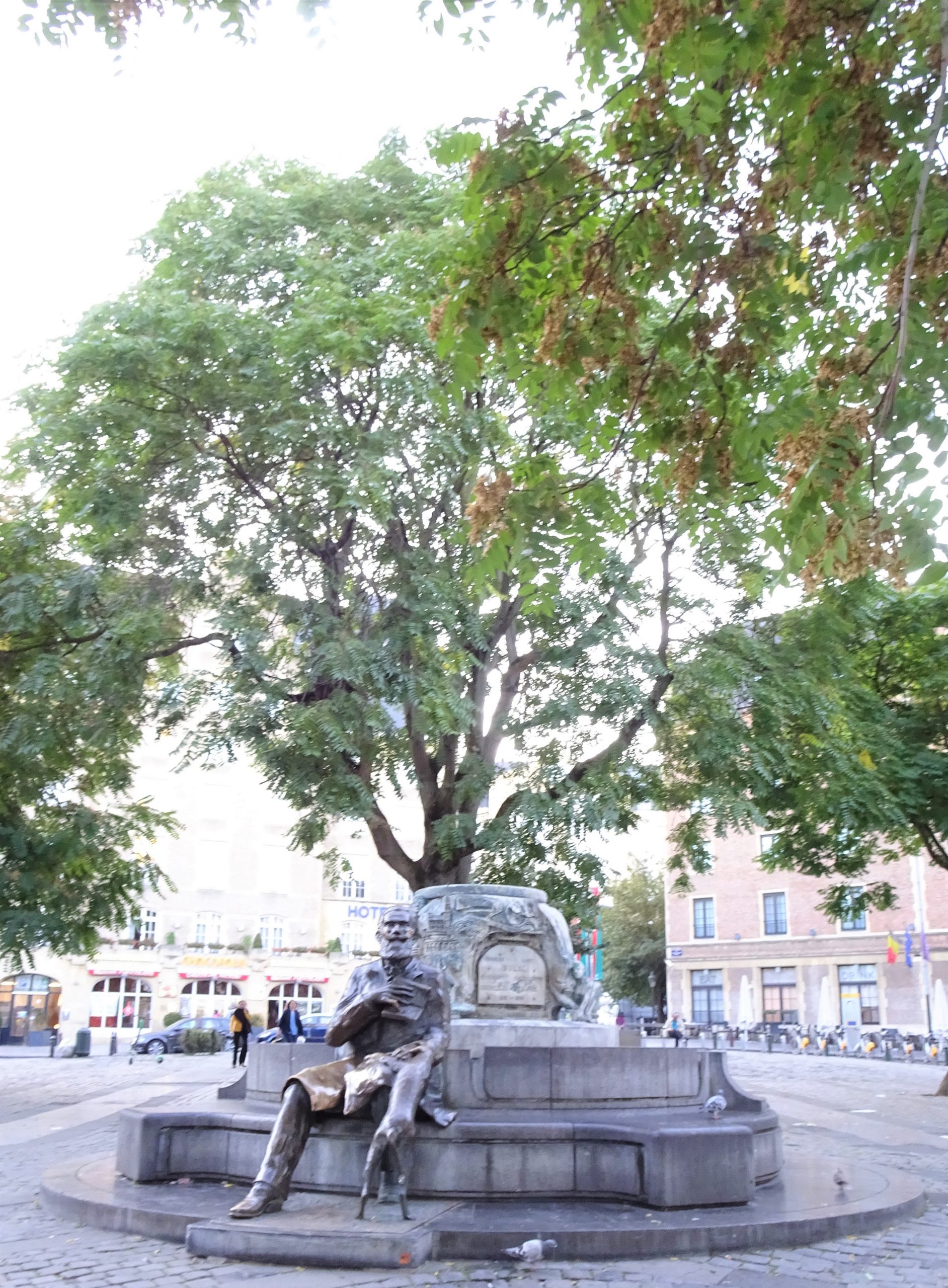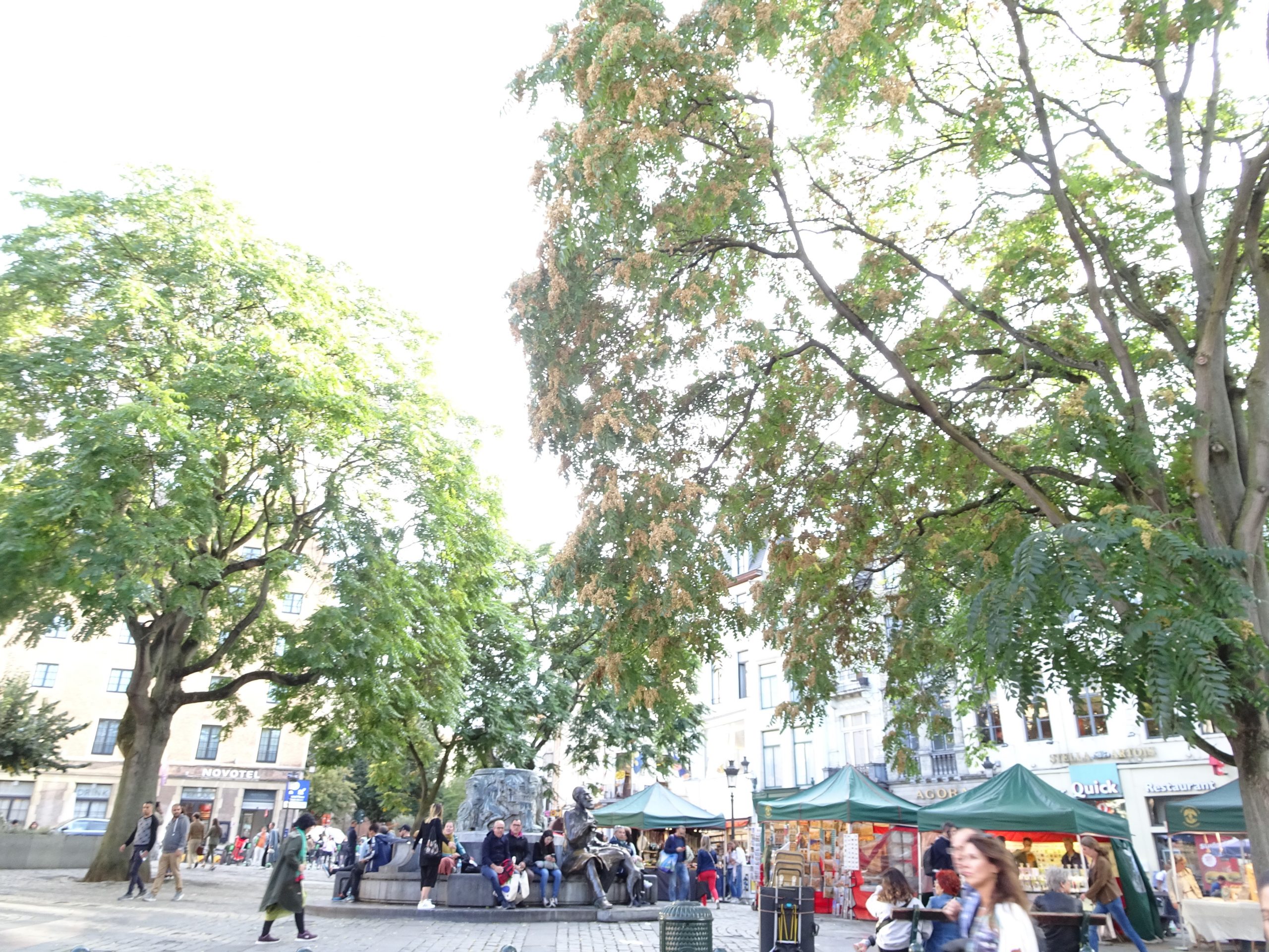 グランプラスから出てすぐ近くのアゴラ広場(Place de L’Agora – Place du Marcé aux herbes)は、樹木に囲まれた小さな広場。パリの都市改造の時代に取りこわされそうになった、グランプラスの建物を、国令に反してまで守った19世紀のシャルル・ビュル市長(と愛犬)の像のある噴水 (Fontaine Charles Buls)もあります。