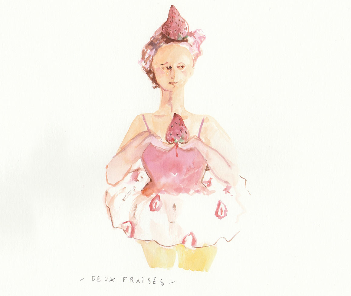 5月のパリのマルシェには、真っ赤で宝石みたいなイチゴが並びます。日本のものより少し小ぶりで、程よい甘さが魅力。パリ在住の画家・田中麻記子さんは、美しいイチゴを見つめているうちにだんだん空想の世界に引き込まれ……、あれあれ、イチゴのタルトの上で甘酸っぱいスペクタクルが??