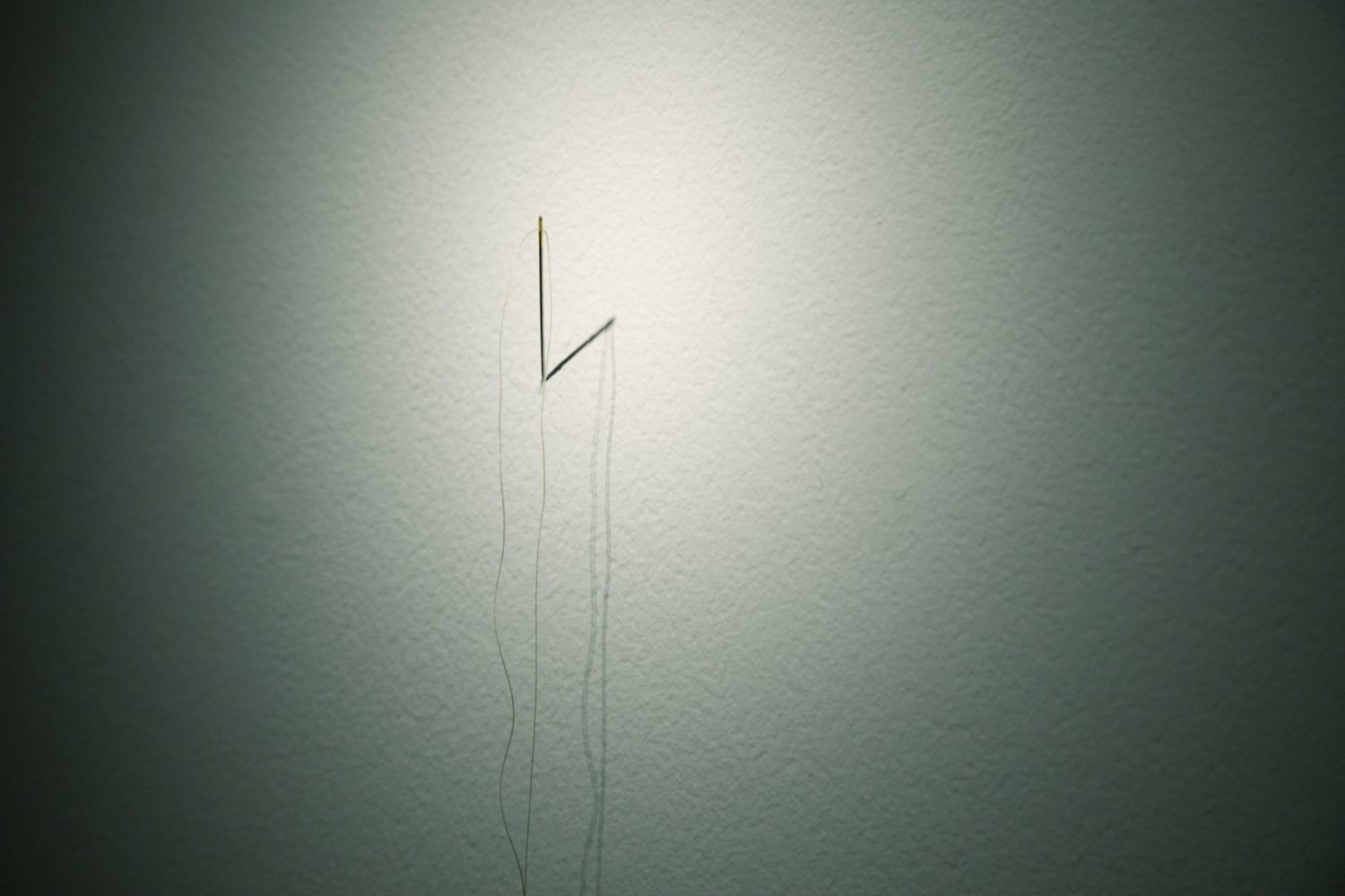 遠藤 布にまつわる展示をしています。今回の展示を象徴する作品から始まって、メインの展示室では私が制作している布が展示されていて、奥の空間ではその布をつくる過程や染色、糸を紡ぐ道具などを並べ、最後に布と工芸にまつわる評論家のテキストが読めるようになっています。入口から作品が始まっているんですが、まずは展覧会のポスターがあって。階段を下りて、踊り場に来ると1本の糸と1点の刺繍作品があります。
