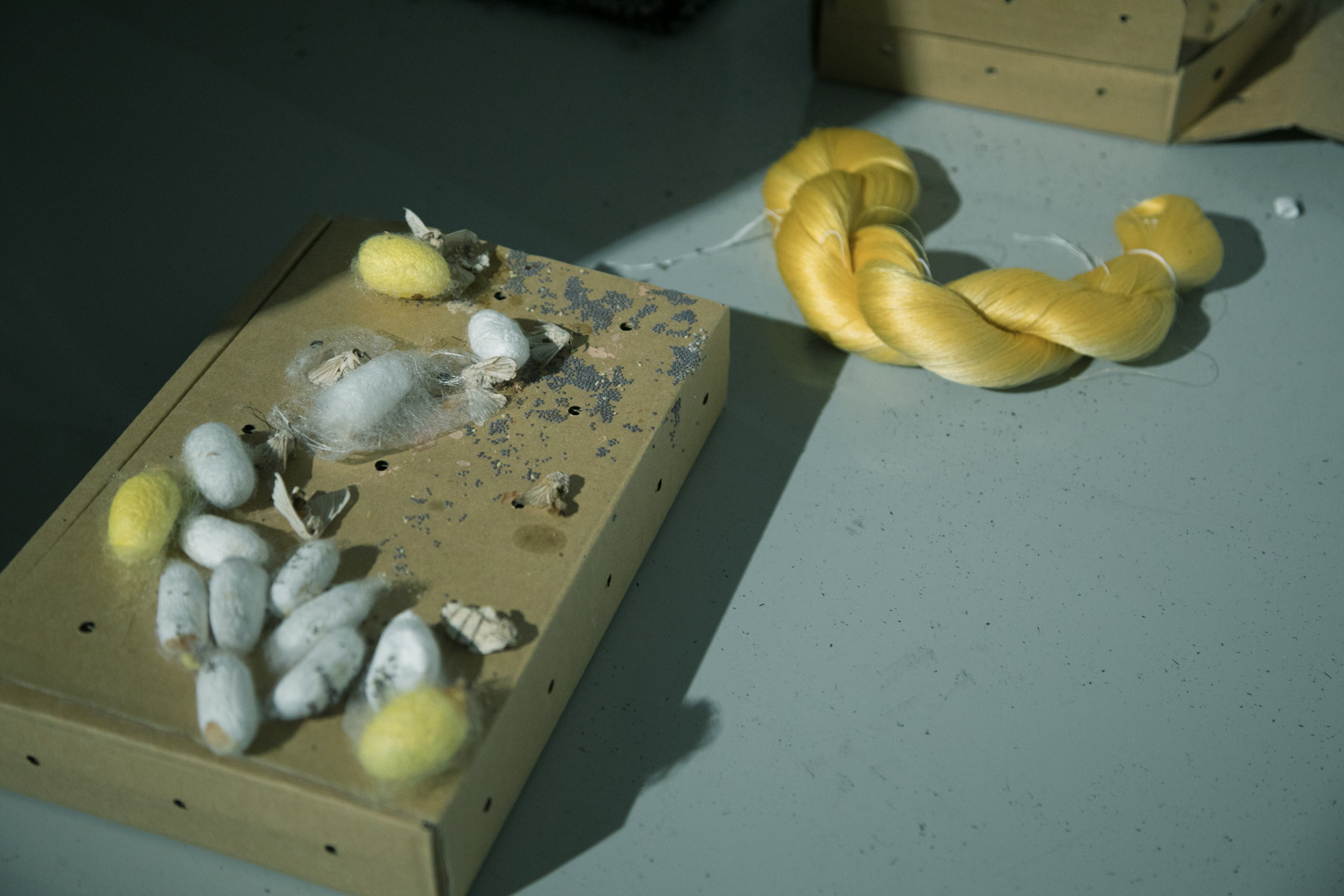 遠藤 そうなんです。人間の肌のたんぱく質ともよく似た性質を持っている素材で、手術の糸に使われたり、これを粉末にして化粧品にしているところも。100℃でも燃えないくらい熱にも強い素材なんです。明治以降、皇室でもご養蚕が行われているように、貴重なもののように思えますが、実は畑はおろか自然界においても害虫だったという説もあるくらいなんです。人間と契約を結ぶことで生存戦略を図っているという状態にはなっていて、人間がいなくなると蚕も生きられない。人間も自然界からしたら、ある種害虫みたいなものですよね。そんな弱いふたつの種が支え合っている構図というのも面白いなと。