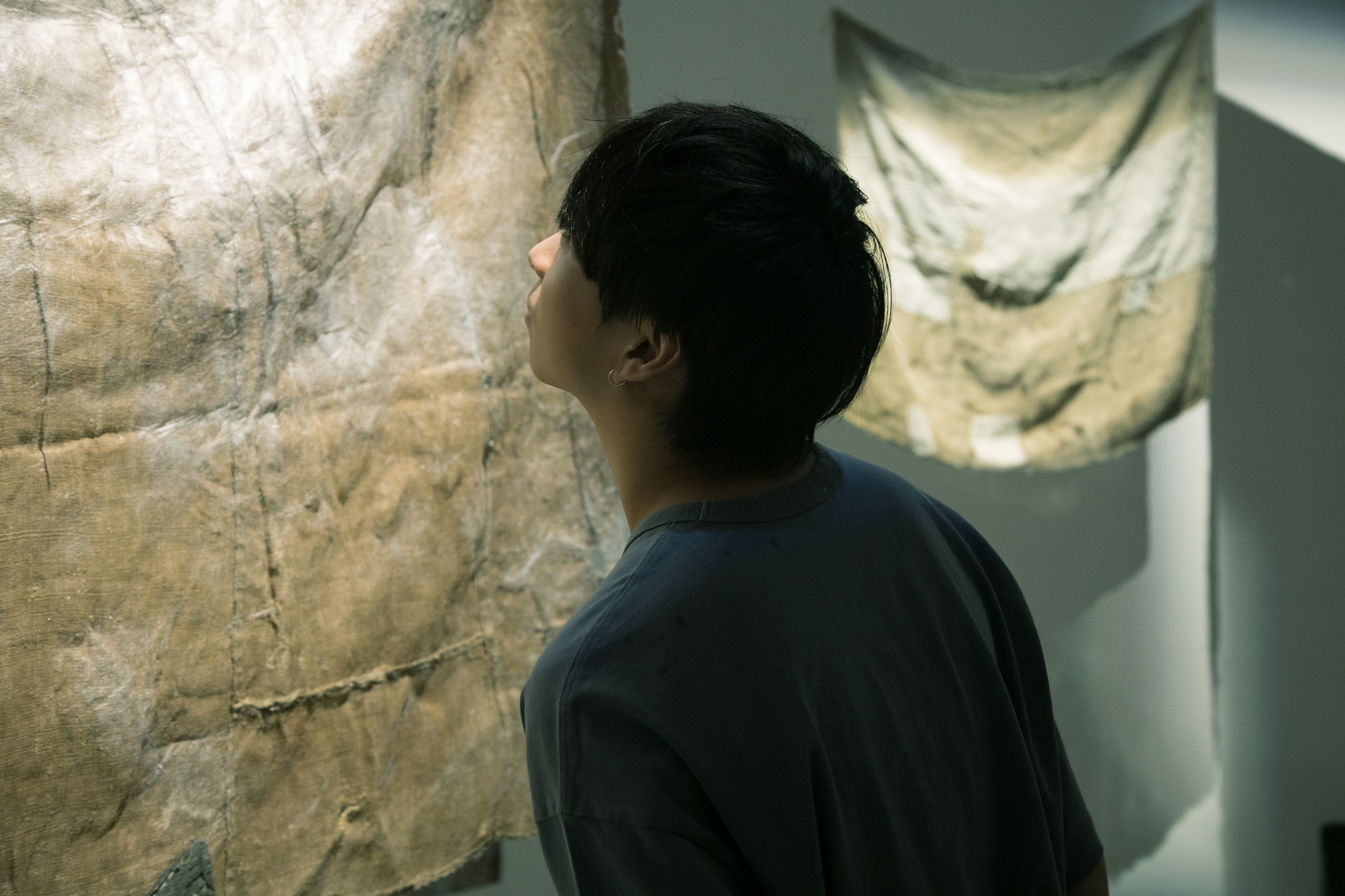 遠藤 この作品では、戦前の麻素材のぼろ布に蚕を這わせて修復しているんですが、農民の方々が使ってきた麻の穴を、ヒエラルキーの象徴のような蚕が一生懸命糸を吐いて修復しているという。価値の逆転がこの場で起きているとも言えます。