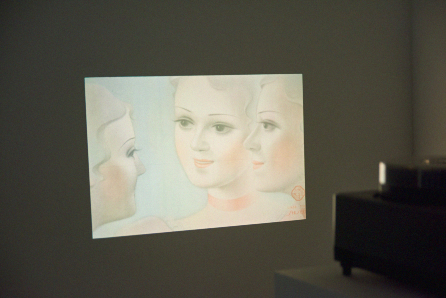 この展覧会の契機になったのはJ&Qの作品《Moulting》だ。Moultingとは脱皮や羽化という意味を表す。彼らは美術史や美術批評、その周囲にまつわる活動や言説を扱いながら、常にアートの権威性について批評的であり、ユーモアとアイロニーをもってアートそのものに疑問を投げ掛けるような作品をつくり続けている。本作品では、近代の日本文化において西洋の美学がどう影響してきたかを語るにあたり、資生堂が創業時より積極的に西洋のモダンアートやファッション、カルチャーを紹介してきたことに着目。膨大なアーカイブから包装紙やパッケージ、新聞広告やポスター、現在の『花椿』の前身である『資生堂月報』等のヴィジュアルを構成し、スライドショーを作成した。リストを見ると1920年代から1950年代までのものが取り上げられている。