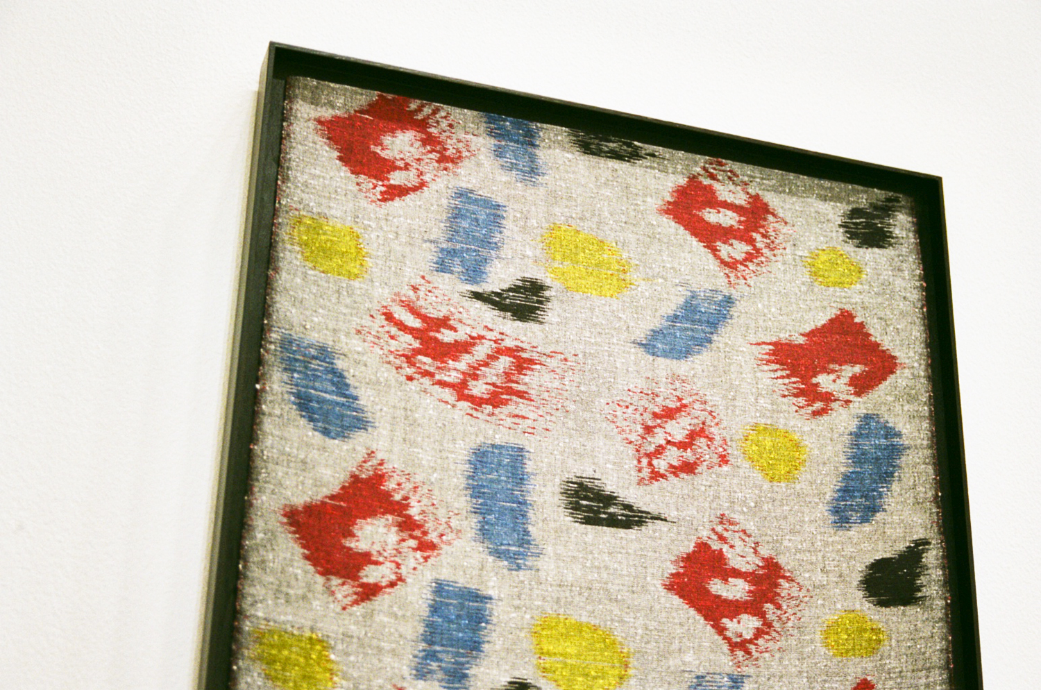 額に入れられた絣の織物は、普通に見ても美しい。確かに並んだ5枚をよく見ると微妙に表情は異なる。だが、これは絵画と呼べるのか。では絵画とは何を指すのだろうか。はたまた工芸と美術の違いは何なのか……、次々に疑問が湧いてくる作品である。