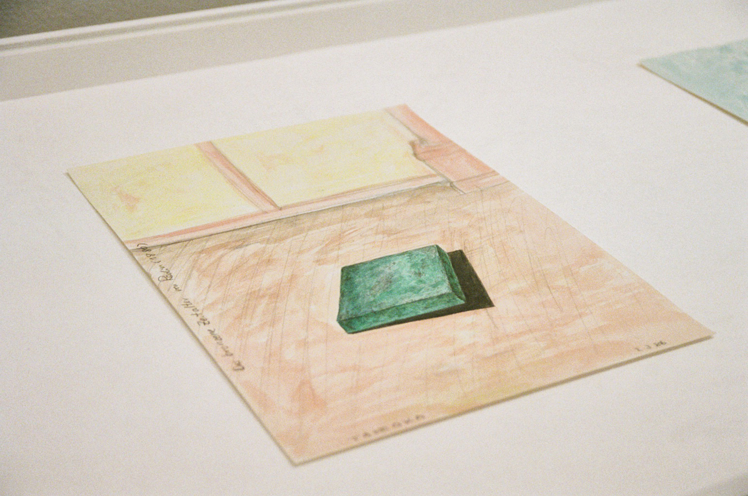本展の作家をセレクトしたJ&Qが、作家たちを招待する際に伝えたのは、「資生堂ギャラリー100周年の展示であること」「参加作家全員の名前」、「可能な限りオープニングに来ること」、「新旧作問わない」のみだったという。作品のチョイスは、各自に委ねられた。J&Qが、会ったこともなく、仕事だけを知っていた作家もいた。全員揃ってインスタレーションすることを想定していたが、台風19号の到来で全員での共同作業は実現しなかったという。J&Qが作家と基本個別にやりとりをし、事前にプランを提示した作家もいたというが、ドゥラートの作品は最後まで分からず、設営するときに作家が手で運んで持ち込んだのだという。展示空間のなかで、一番ミステリアスな存在であるが、描かれているのは誰もが知っている世界最大のゴシック様式の建築で世界遺産にも認定されているケルン大聖堂だ。ケルン大聖堂で、入手した日本語パンフレットも会場には置かれていた。シンプルな紙に鉛筆で緻密に描かれた、荘厳な建築物が示す意味は何なのだろうか。何を思いながら、ケルン大聖堂を描いたのだろうか。作家は慣習的な作品の説明を省き、見る人に委ねる形の方が、作品の佇まいとして寛大だという。