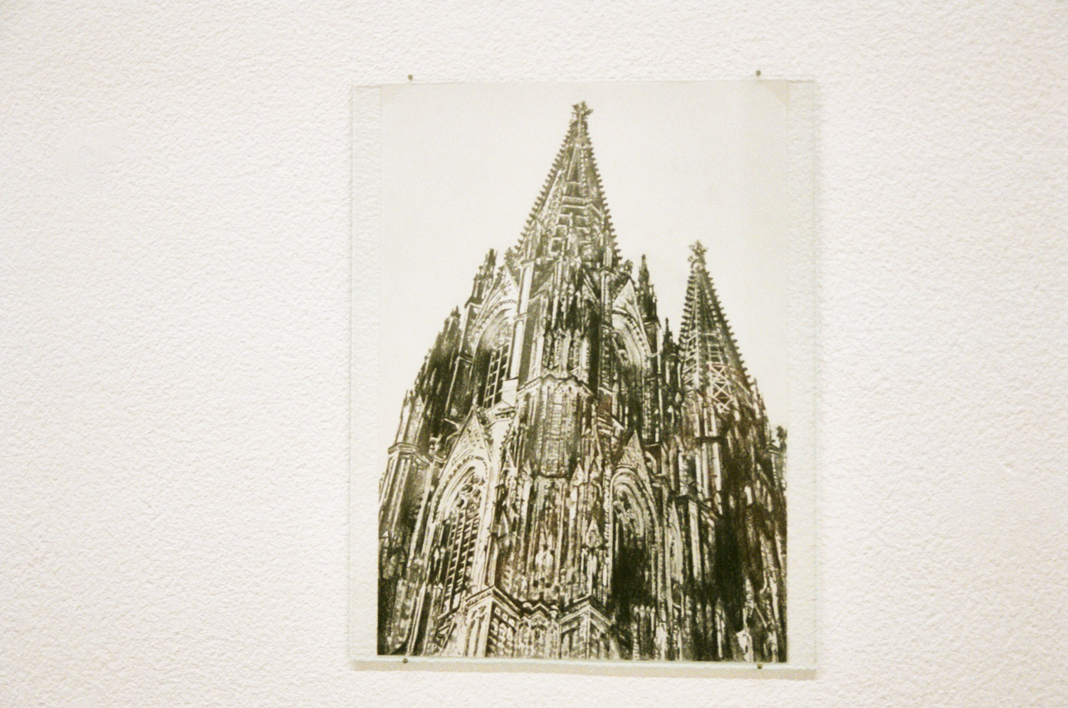 会場にぽつんぽつんと点在するA4サイズのドローイング。決して大きくはないが、重厚感があり存在感のあるイメージの作品を制作したのは、本展の参加作家で一番若い1984年生まれ、ベルギー・ブリュッセル在住のサーラ・ドゥラートだ。ケルンの大聖堂を描いたという3点のイメージだが、それ以外の情報は一切書かれていない。アーティストトークの際にも、作家は多くを語らなかった。