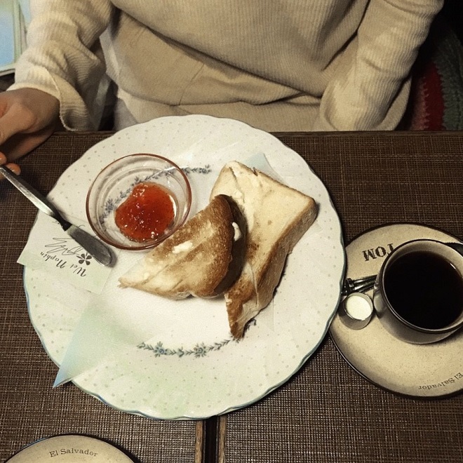1階から昇降機で上がってくる珈琲たち。トーストはもちろん厚切り。溶けてもなお、残るたっぷりのバター。普段あまり使わないジャムも、ここでは余すことなく使いたくなるのはなぜだろう。