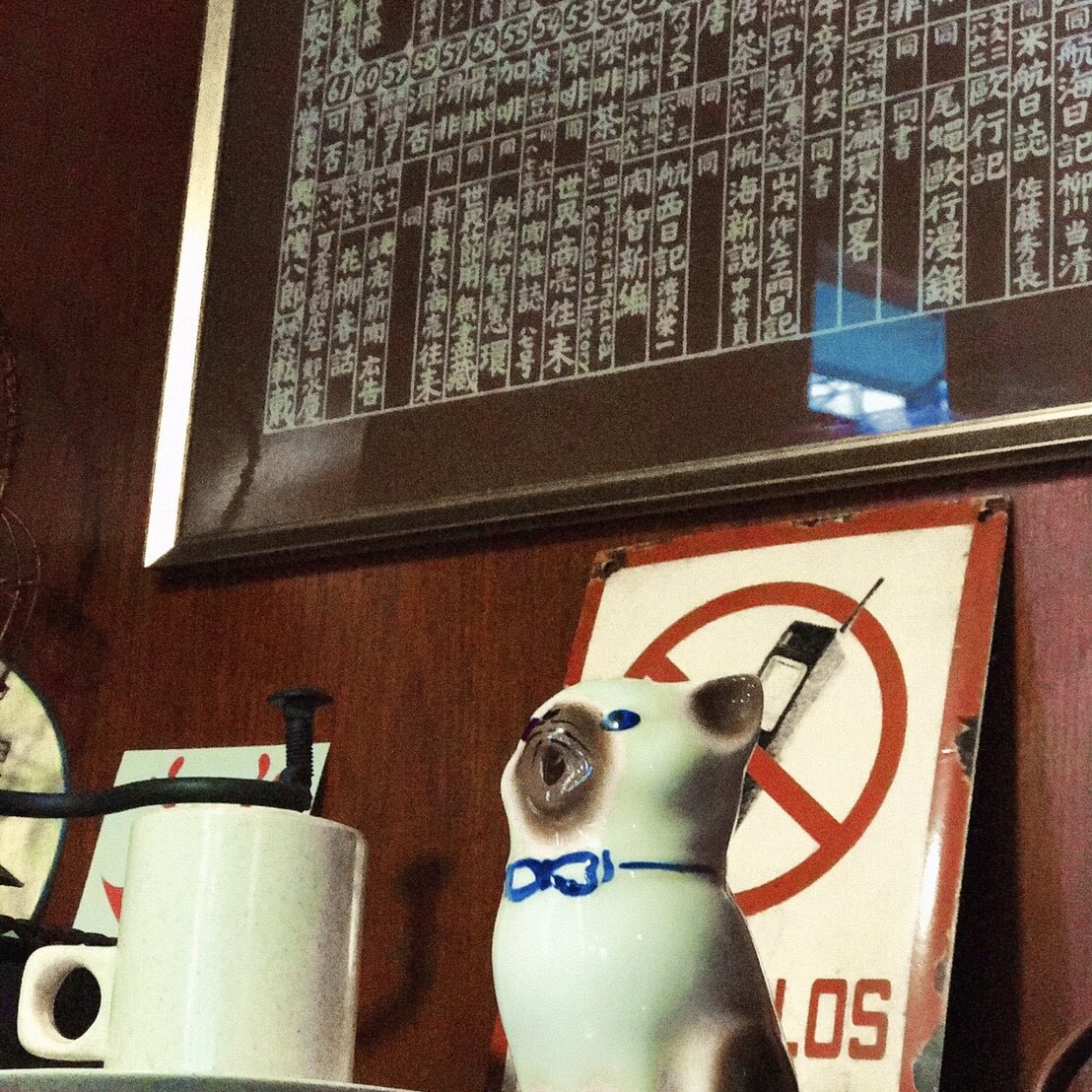 お気に入りの2階席は貸切。人がいなくて寒いでしょう、とママさんが暖房を強めてくれた。いつも座る席は階段を上がって手前の端。口をほの字に開けた猫の置物と、”かうひい異名熟字一覧”が飾ってある。