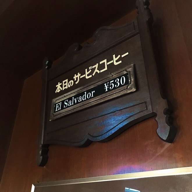 本日のサービスコーヒーのEl Salvador。カップには豆の名前El Salvadorと、店名が記されている。このカップは昔作られたものらしく、今はこんな贅沢できないわねぇ、とママさんはしみじみ。