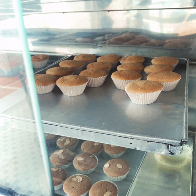 シンガポールの人々はこの暑さの中でもあったかい飲み物をよく飲んでいる気がする。飲み物で身体を冷やしたりしなくていいなぁ、見習いたい。そんな呑気なことを考えていたら、お店の入り口にカップケーキがたくさん入った棚のような大きなケースを発見。どうやらセルフサービスで、自分でお皿にのせてテーブルに運んでくるシステムのようだ。私も早速選びに行こう。なんだか学食みたいな気分で懐かしい、日本の喫茶店では感じないまた別の懐かしさだ。