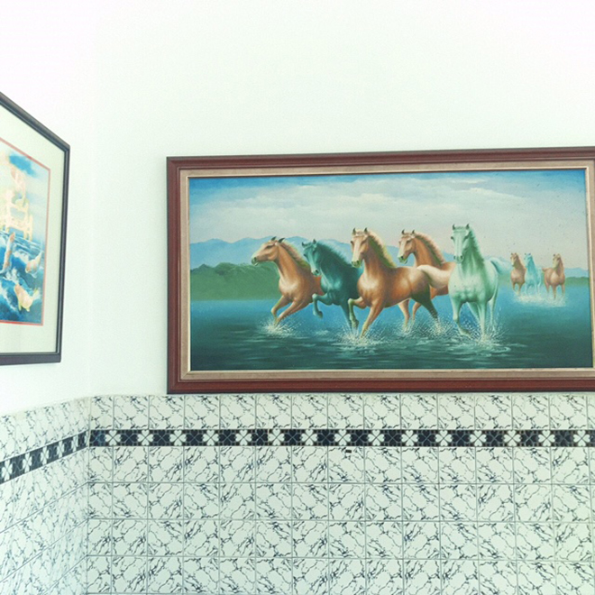 1962年創業当時から変わらないという独特な雰囲気の店内。壁も床も全面タイル張り、ドアもなければクーラーもなし、あるのはクルクルとせわしなく回る扇風機だけ。奥の厨房は丸見えでお母さんたちがいそいそとコピを淹れている。壁には幻想的な馬の絵や鯉の絵……、一瞬は暑さが引いたものの、やはり汗ばむくらいの熱気とこの空間、なんだか銭湯のお風呂上がりにコーヒー牛乳を飲んでいる、そんな風景をなぜか思い出してしまった。