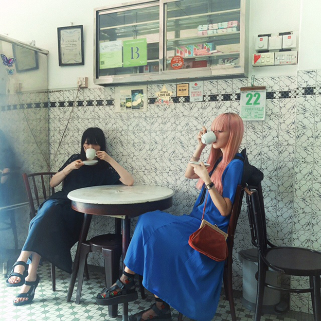 シンガポールが暑すぎるとはいえ、こんなノスタルジックな空間に足を踏み入れるのにTシャツに短パンで行くわけにはいかない。友人が送ってくれたお店の写真で外観のブルーの壁がとても印象的だったので、mameのブルーのワンピースを着た。袖がレースの夏仕様、扇風機の風でひらひら揺れていた。奇しくも友人もブルーのワンピース。やっぱりこのお店にはブルーが似合うよね。私はブルーが好き。ブルーが似合う空間はもっと好き。国境を越えて友人になった彼女と、日本でしか実現できないと思っていた喫茶店でお茶をするという行為が異国で、そしてこんな素敵なお店で実現できたことはとても嬉しい思い出になった。