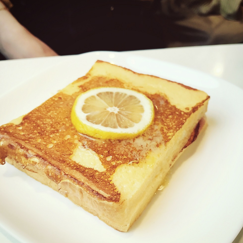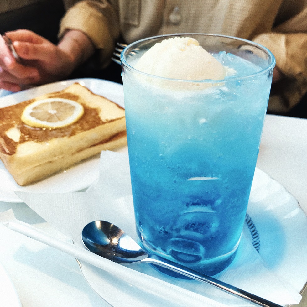 いつもフレンチトーストとクリームソーダを注文する。ここのフレンチトーストはレモンの輪切りがのっていて、クリームソーダの色はブルー。この二つを一挙に目の当たりにすると、店先の看板に与えられた高揚感がまた一回り大きくなって胸を打つ。ふわふわの中にもしっとりと卵に浸かった濃厚なフレンチトーストはレモンの酸味とよく合わさり、気づいたら、ない!と思うほど夢中で食べきってしまう。ブルーのクリームソーダはグリーンのクリームソーダより好き。アイスが溶けると優しいブルーになる。