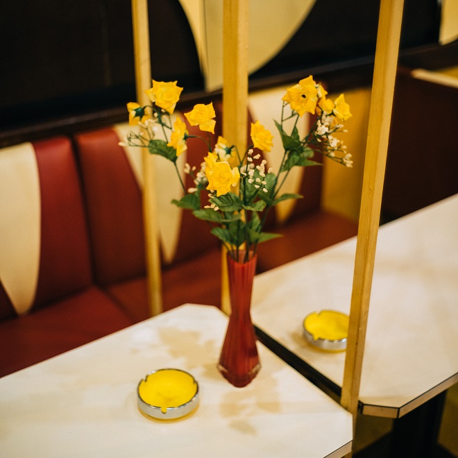 壁と椅子のデザインがここの一番好きなところ。ブルーとイエローの飾り壁と赤とクリーム色の革張りの椅子。一目惚れと言ってもいい、そして一生憧れの存在である。どれも落ち着いた色みでお互いを邪魔しない。53年の時を寄り添って共存している。若かったふたりが年月を経ても気持ちを1ミリも変えずに共にしているよう。そんな彼らをいつも目の当たりにするとため息と共に、お願いだからずっとそばにいてほしいと思う。