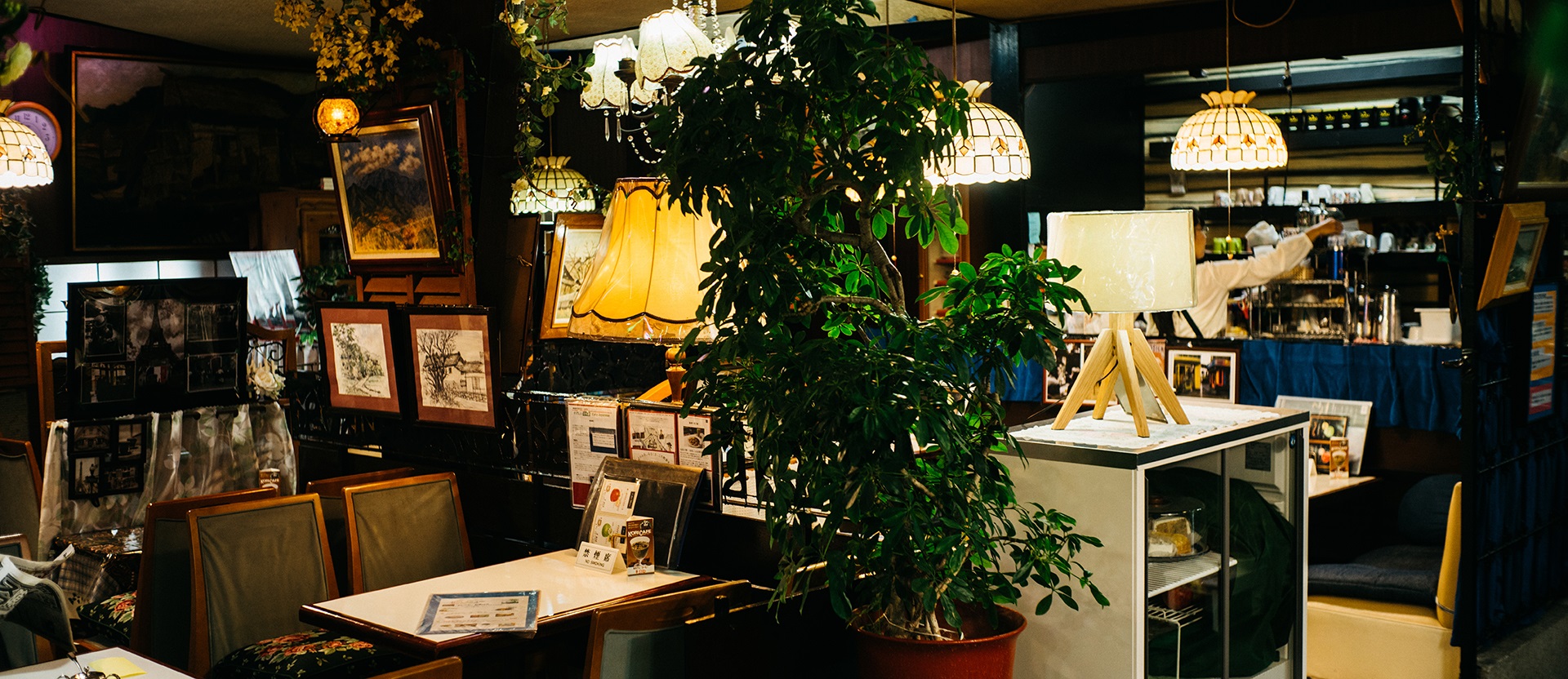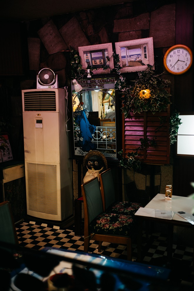 いつも店内に足を踏み入れると目に留まるチェッカーフラッグ柄の床、信楽焼の狸に、たくさんの鏡や薄紫色の蛍光灯。全てが今まで出会った喫茶店では目にしたことのないものたち。もちろんここには、観葉植物やバラのゴブラン織りのクッション、きらきらと光るシャンデリアやレースのカーテンなど喫茶店に馴染み深いものもたくさんある。その中で当たり前かのように顔を揃えた異色のメンバーたち。ここは、何時で何処で何なのだろうと不思議な感覚に引き込まれる。