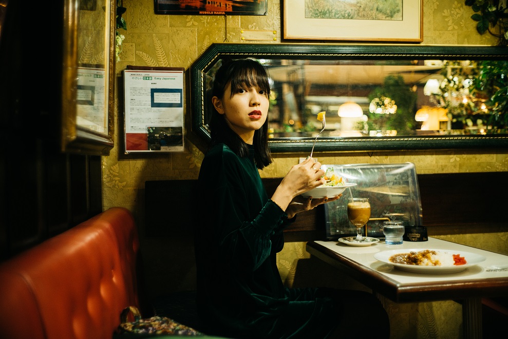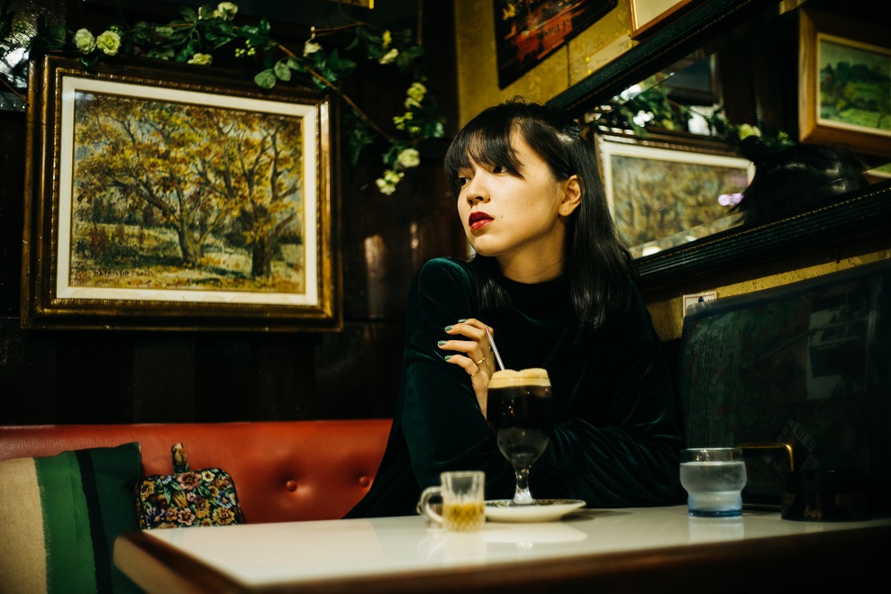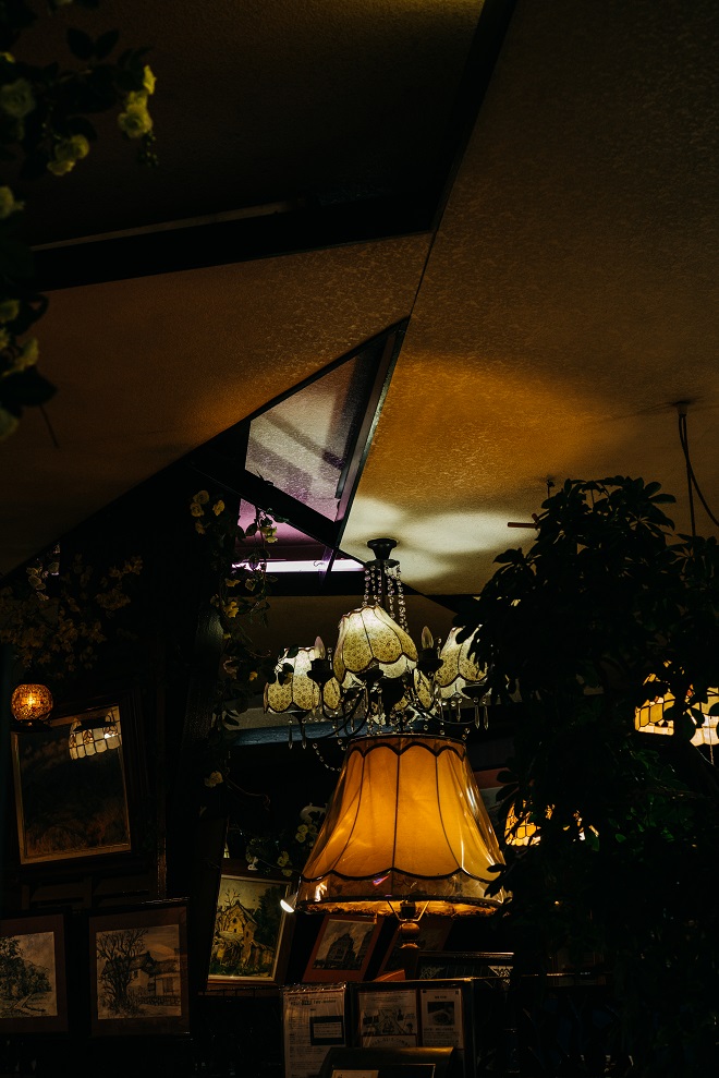 しかし、やっぱりここは不思議な空間だ。天井を見上げると三角形のような図形が折り重なったくぼみがあり、薄紫色の蛍光灯が妖しく光っている。マスターによるとこれは植物が綺麗に見えるようにする植物灯だそう。なんだ、全く妖しいものなんかじゃなく素敵なこだわりだった。今日は、ベロアのワンピースを着て行った。喫茶店にベロアの服が似合うことはわかっていたけど、今日は植物灯やシャンデリアの光でいつもよりきらめいて見える気がして、この服がもっと好きになった。マスターのこだわりはこの場所を素敵に見せるだけじゃなく、訪れる人の気持ちにも素敵に作用する。