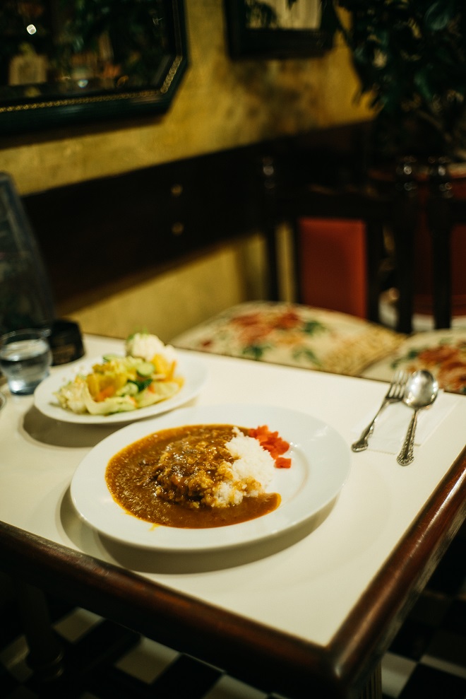 カレーが運ばれてきたと思ったら、同じくらい大きなお皿で山盛りのサラダもやってきて驚いた。フルーツがたっぷり入った特製サラダはドレッシングも自家製で、またここにもこだわりを発見。とても手をかけて作られた眩しいサラダ。なんだか嬉しくなって、ついお皿を抱えてモリモリと食べてしまった。食べ終える頃にはもちろん満腹。よくおばあちゃんの家に行くと、あれもこれもたくさん食べなさい!と美味しいものがどんどん出てきてついたくさん食べてしまう、あのときの身も心も満腹になる感覚に似ていて、もう今夜はここで布団を敷いて眠りたい気持ちになった。
