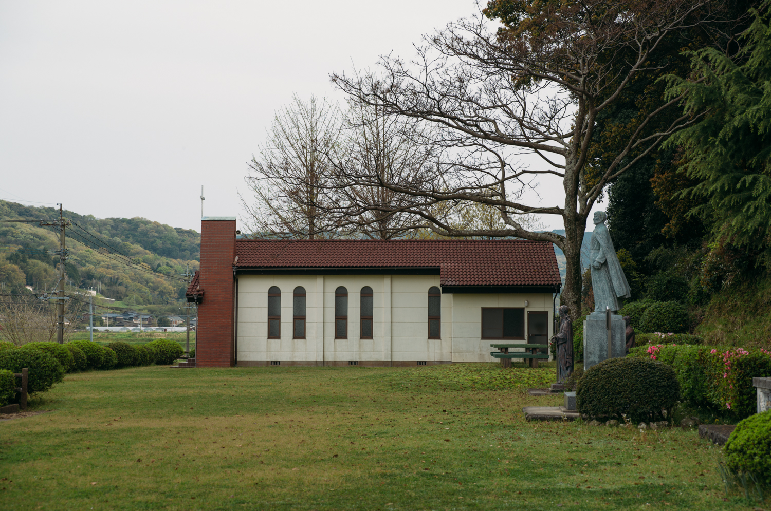 岩戸寺を後にして訪れたのは、国東半島の北東、沿岸部に位置する国見町岐部。車を降りると、国東で初めて眼にする、質素なキリスト教会が視界に飛び込む。その横にはまっすぐ海を見据える神父の彫像がある。