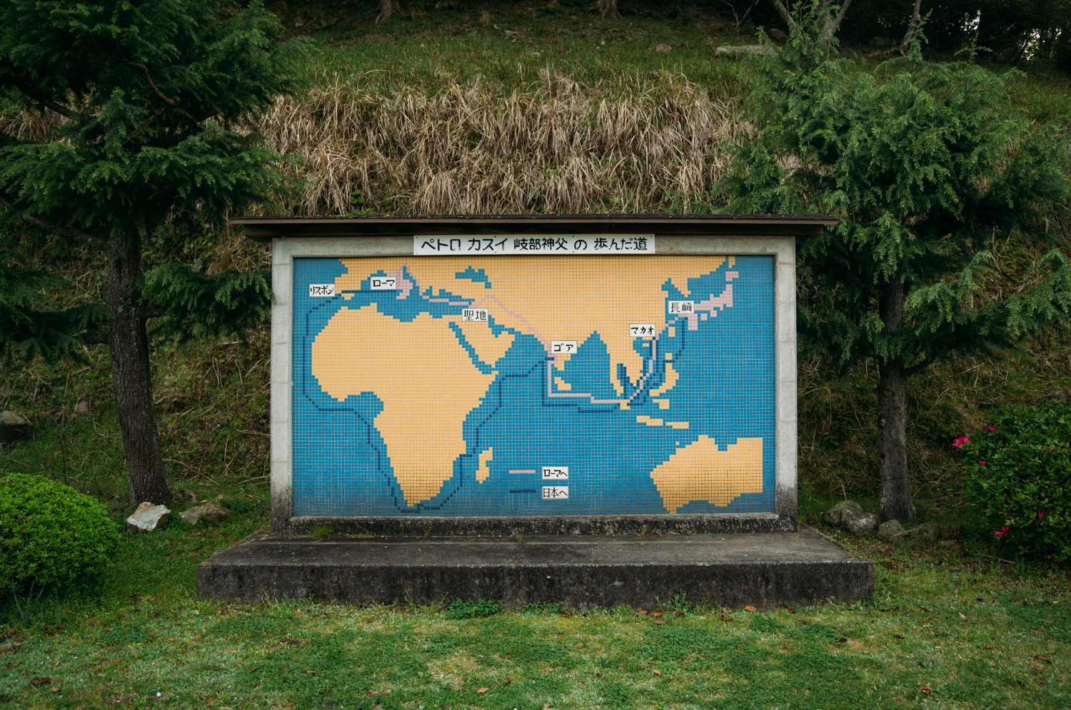 これは1965年、自身もカトリックでありキリシタンの受難をテーマに数多くの作品を残した彫刻家、舟越保武の手によるものである。そしてその横には世界地図が記された看板があり、こんな言葉が書かれている――「ペトロカスイ岐部神父の歩んだ道」。