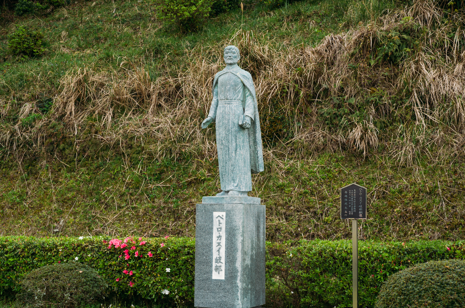 銅像のモデル、ペトロ・カスイ岐部は、1587年(安土桃山時代)、この地に生まれ、江戸時代にかけてカトリックの司祭として生きた人物である。