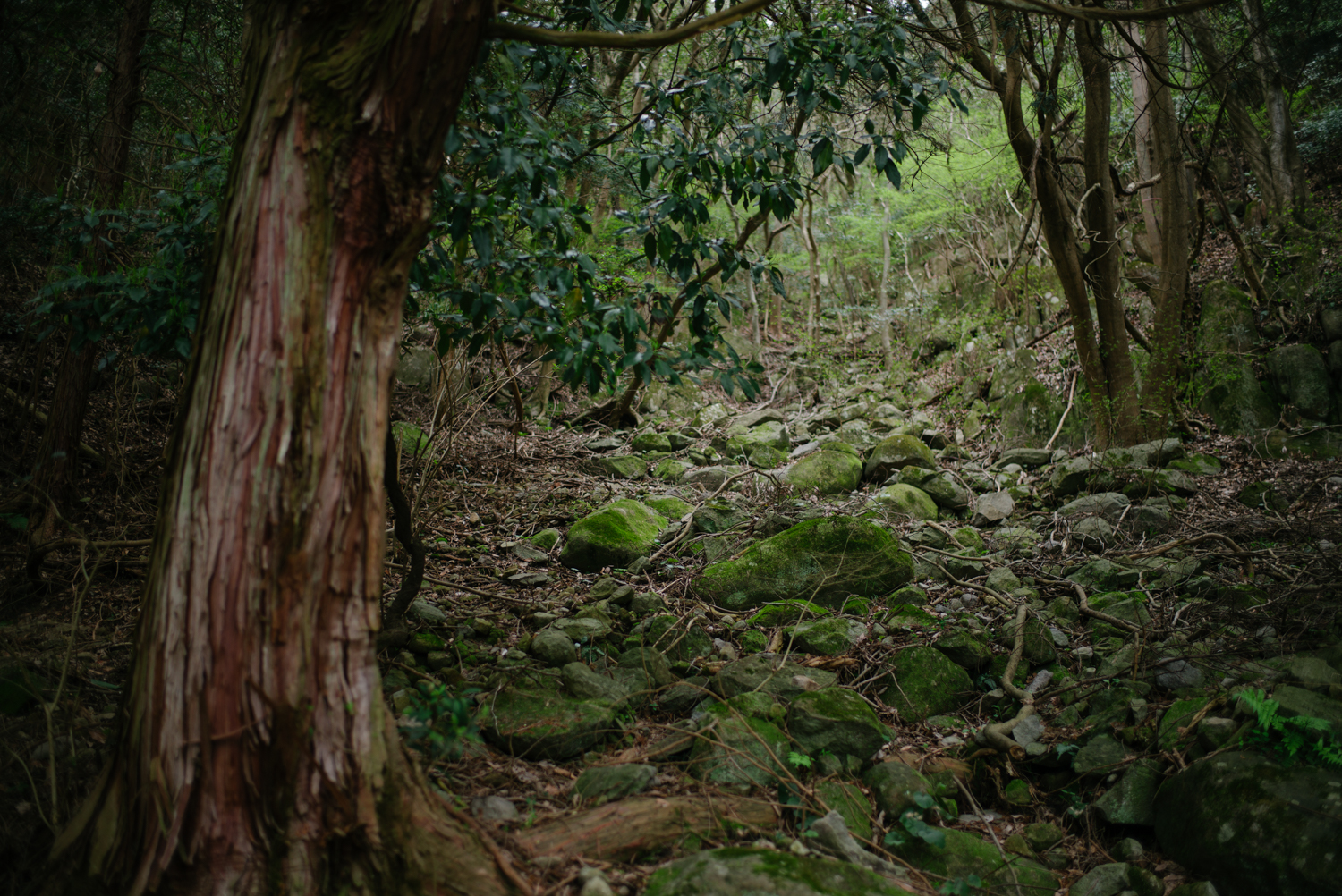 車を停めて、地元ガイドとともに山へ。しばらくはなだらかな傾斜の杉林が延々と続いていく。標高475mと聞いていた私は、このとき、大した装備も心構えもなかった。むしろ重たいカメラを2台も持っても余裕しゃくしゃくの気分だったが、それが大きな失敗であった[※5]と気づくのに時間はかからなかった。