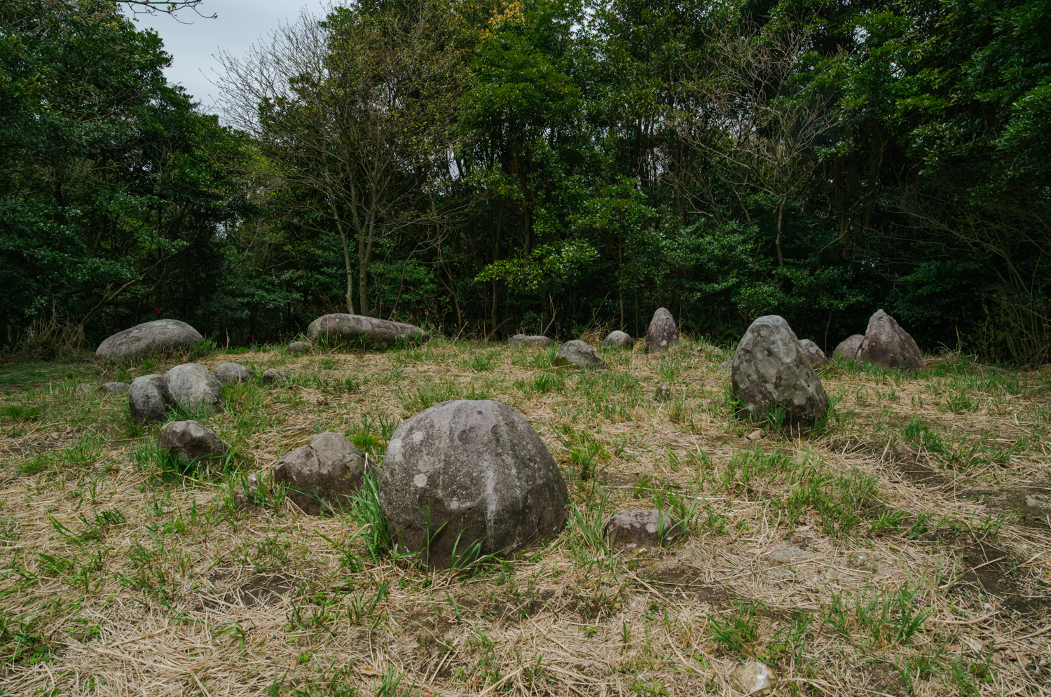 息を切らし、いよいよ心が折れかけ始めたその頃、ついに頂が見えた。とはいえ、汗だくになって辿り着いた山頂の景色は素っ気なく、原っぱのような草むらの中に、ゴロゴロとした岩がおよそ20個ほど並ぶのみ。一見すると自然の岩場のように見えなくもないが、よく見れば人為としか思えない、不思議な並びである。