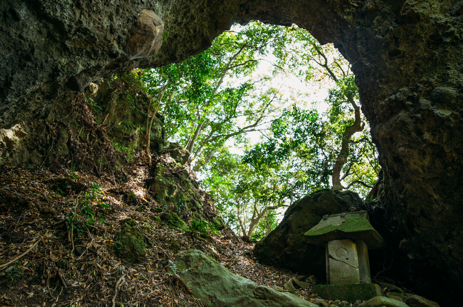 そのすぐ脇には、おそらくこの寺の由来である、天の岩戸を連想させるような観音開きに合わさった岩屋があり、簡素な寺とは対照的に、ダイナミックな光景をつくりだしていた。