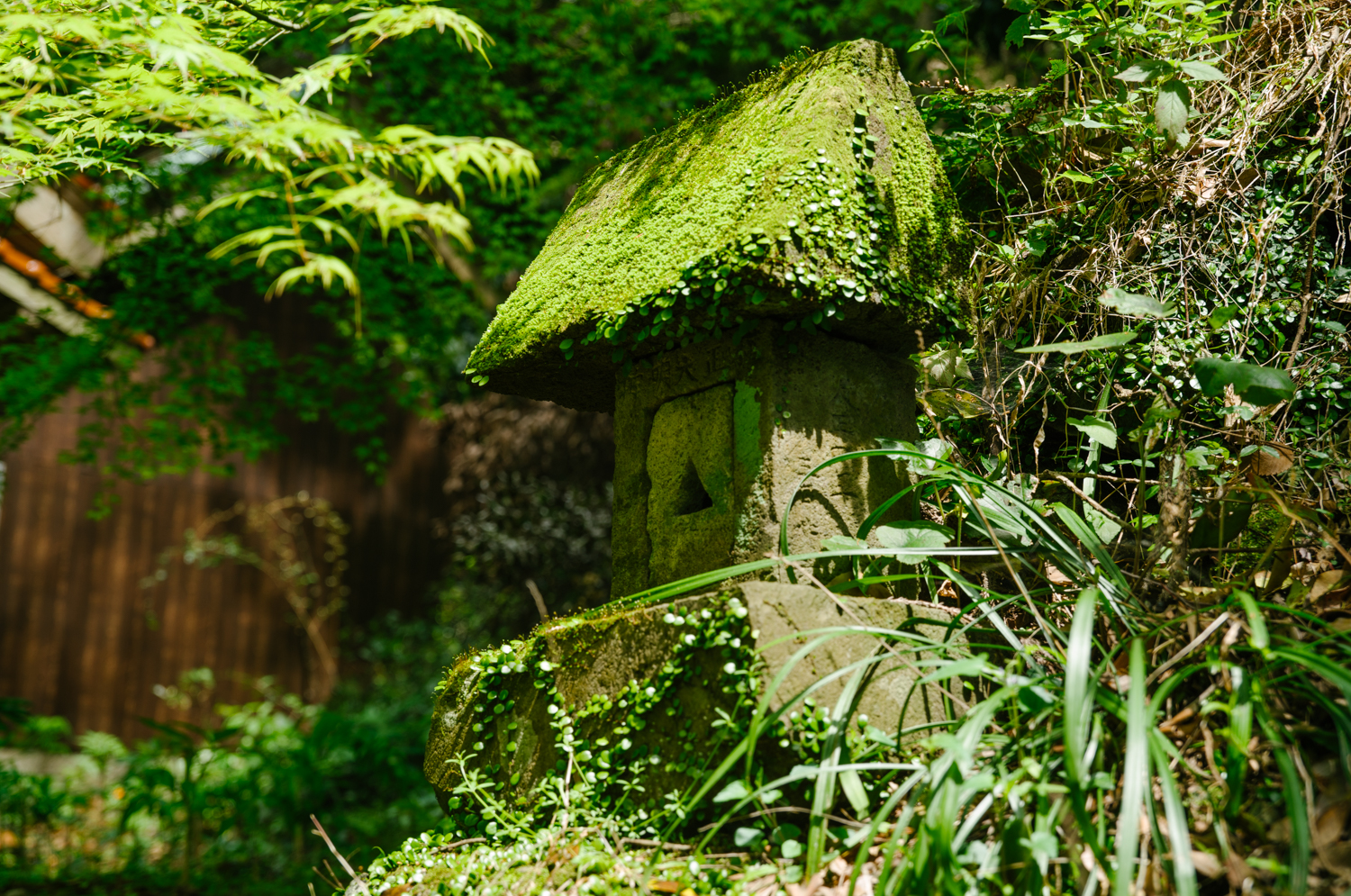 神社の境内もまた芝生のように苔が埋め尽くす。周りにゴロリとある石塔にも苔がしぶとくまとわりついている。すでに国東で見慣れた光景だが、ここは一層苔が深くて、視界という視界を緑が埋める。