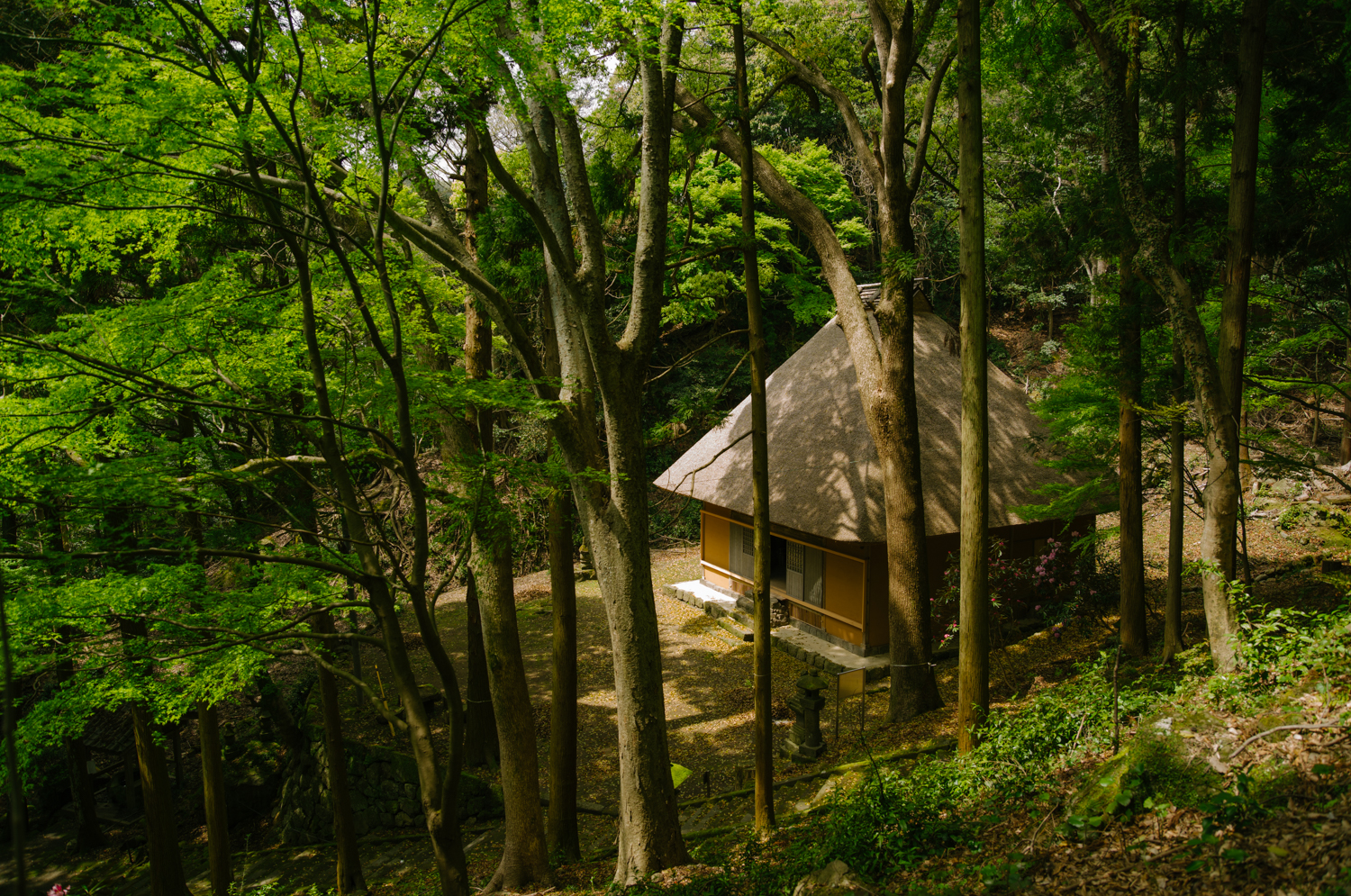 山を背に下を見下ろすと、茅葺き屋根の古民家のような建物があることに気づく。聞けば、この建物は寺社ではなく、国東の奇祭、修正鬼会(しゅじょうおにえ)[※1]が執り行われる講堂だという。